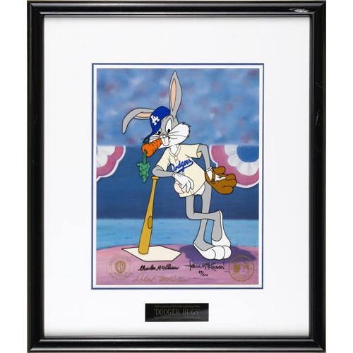 <B>"Dodger Bugs" Limited Edition Hand Painted Cel #93/300 Original Art (Warner Bros., 1992).</B></I> The carrot eating varmint sports a Los Angeles Dodgers uniform, in this hand inked and hand painted cel, which is mounted against a colorful lithograph background. The art has an image area of 9" x 12". Contains both the official Warner Bros. and Major League Baseball seals, and is signed by brothers Tom, Robert, and Charles McKimson. Framed and in Excellent condition.