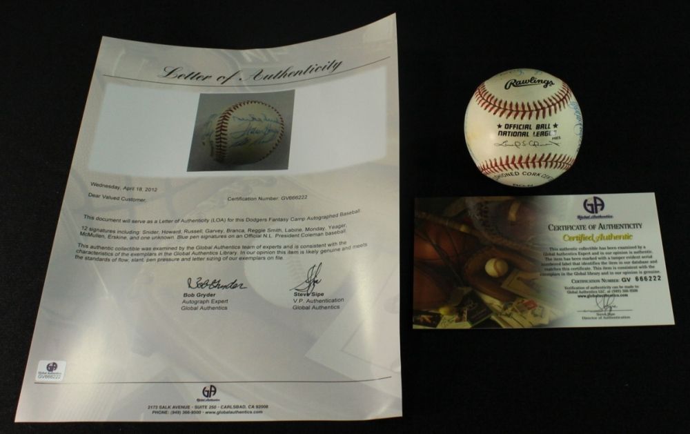 Official National League Baseball hand signed by 12 former Dodgers. Autographs include Duke Snider, Bill Russell, Ralph Branca, Frank Howard, Steve Garvey, Reggie smith, Clem Labine, Rick Monday, Steve Yeager, Ken McMullen, Carl Erskine and one more. The baseball includes a Global Authentics (GA) LOA for authenticity purposes.