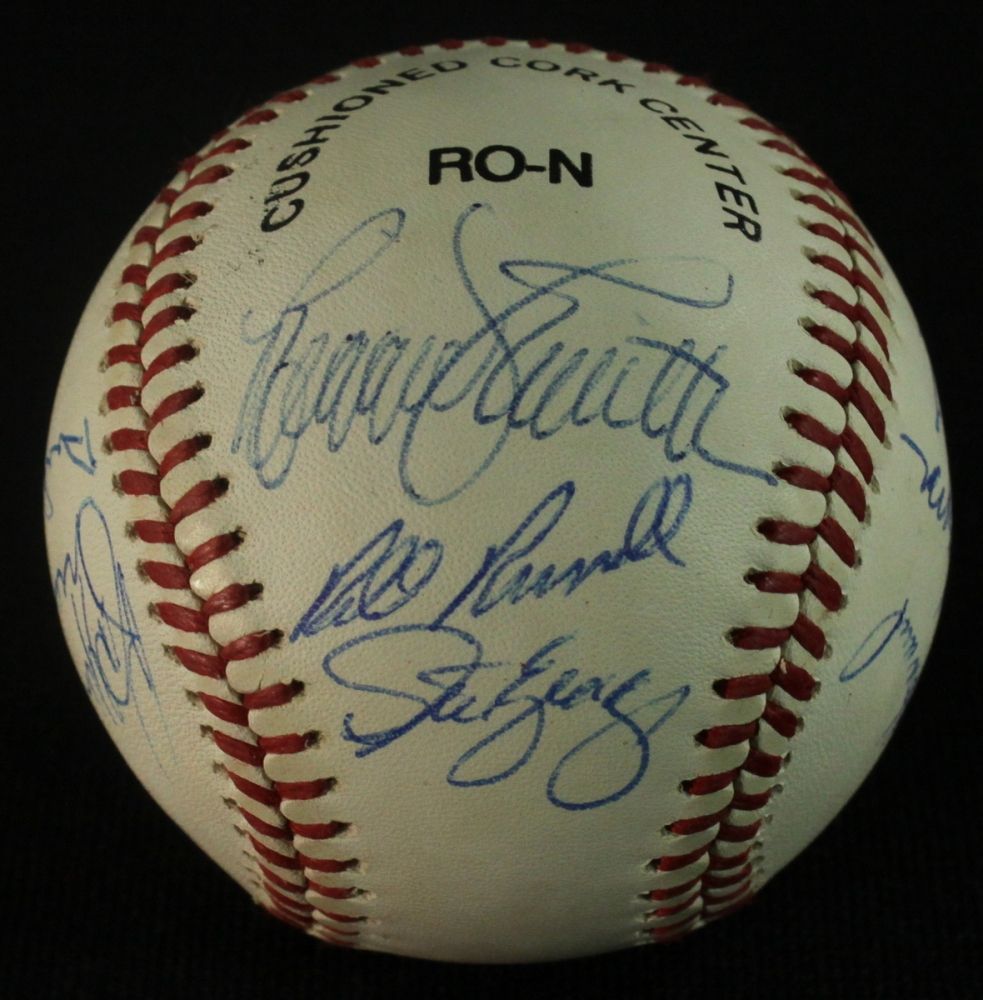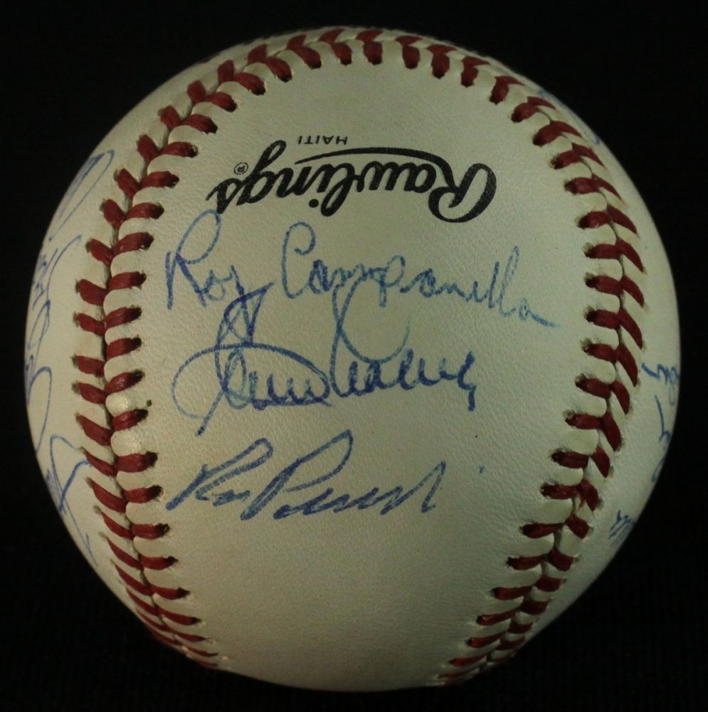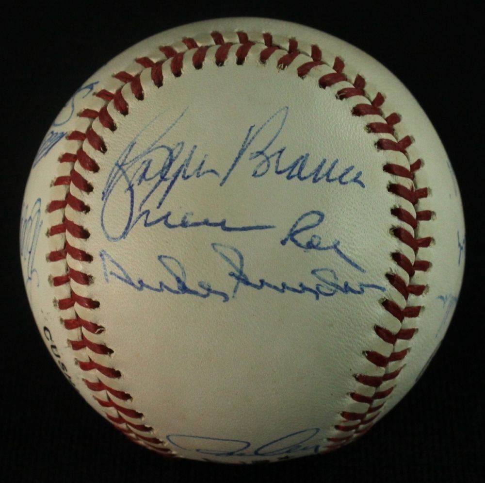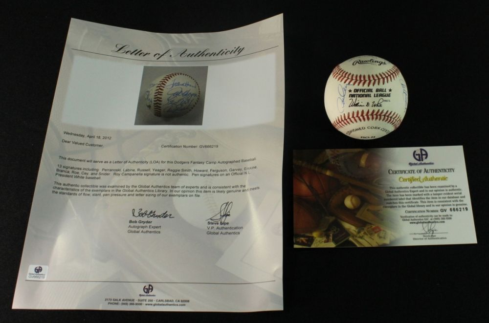 Official National League Baseball hand signed by 13 former Dodgers. Autographs include Ron Cey, Duke Snider, Bill Russell, Ralph Branca, Frank Howard, Steve Garvey, Joe Ferguson, Reggie Smith, Preacher Roe, Clem Labine, Steve Yeager, Carl Erskine and Ron Perranoski. The baseball includes a Global Authentics (GA) LOA for authenticity purposes.