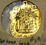 Gold shield style pin, Dodgers First game in Los Angeles in blue lettering, April 18, 1958 in gold lettering on black background