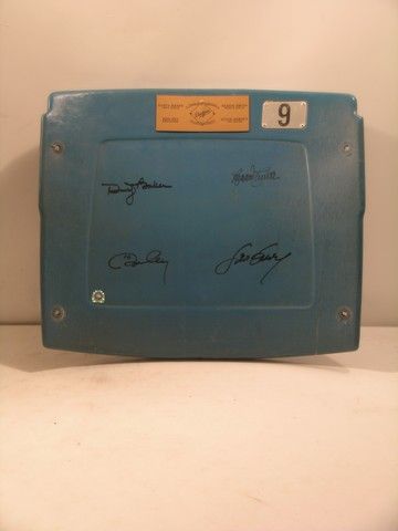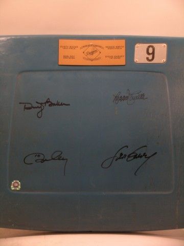 Dodgers Record Setting 30 Homeruns Limited Edition plastic chair back with a plaque on the front and signed by Dusty Baker, Reggie Smith, Ron Cey, and Steve Garvey. Includes the seat number 9. Purchased directly from Dodger Stadium. A true rare collectable, since there are no other seats like this with the signatures and actual reserve seat number available for sale. (Approx. 19 1/2" x 17) Oversized item. Additional Postage Required.