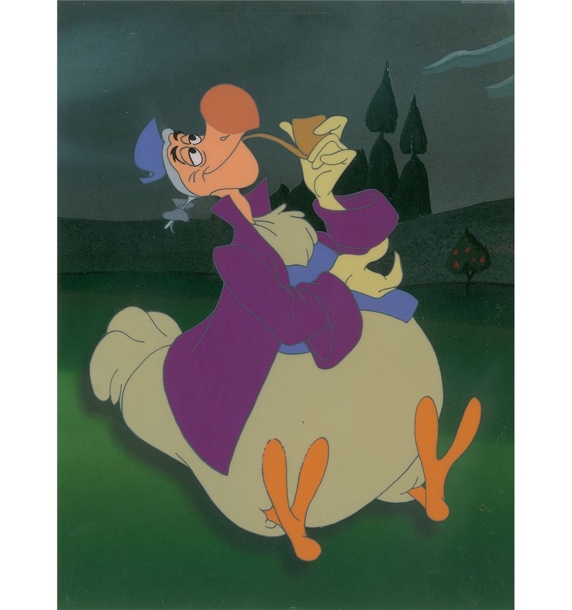 (Walt Disney Studios, 1951) Original production cel featuring Dodo Bird from Alice in Wonderland, depicting him smoking a pipe. The cel is slightly trimmed to 10 x 7.75 and placed on a studio copy background. Image measures 7.5 x 6.5. In fine condition.