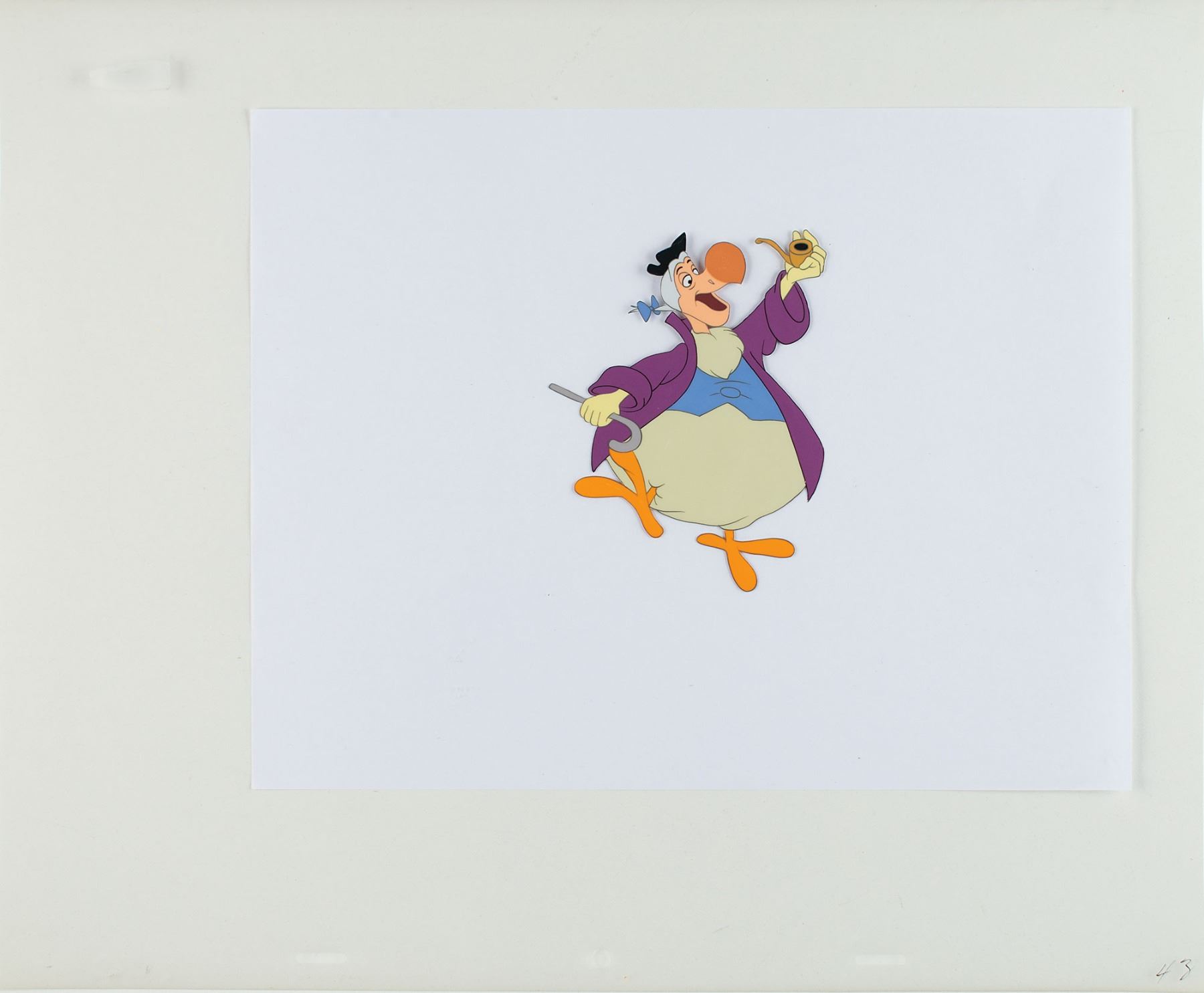 (Walt Disney Studios, 1951) Original production cel featuring Dodo from Alice in Wonderland, which depicts the large bird with cane and pipe in a colorful full-length pose. Image measures 3.5 x 4.5, with overall dimensions of 15.5 x 12.5, and the lower right marked "43." In fine condition.