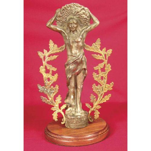 Doe-wah--jack Round Oak Stove White Metal Stove Topper mounted on walnut base. Original leaf brackets, very good original condition. 11 inches tall.
