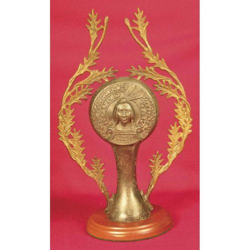 Doe-wah-jack Round Oak Stove White Metal Stove Topper mounted on walnut base. Original leaf brackets, excellent condition. 12 inches tall.