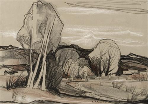 Doel Reed (1895-1985). Along the Rio Hondo, 1976. 14" x 19 1/2" conte crayon original. Signed lower right. (est $2,000-3,000)