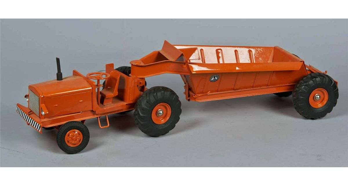 Orange with working steering wheel and "Euclid The Pioneer" and "The Charles Wm. Doepke Mfg. Co. Rossmoyne, O., Model Toys" stickers. Condition (Excellent). Size 22-1/2" L.