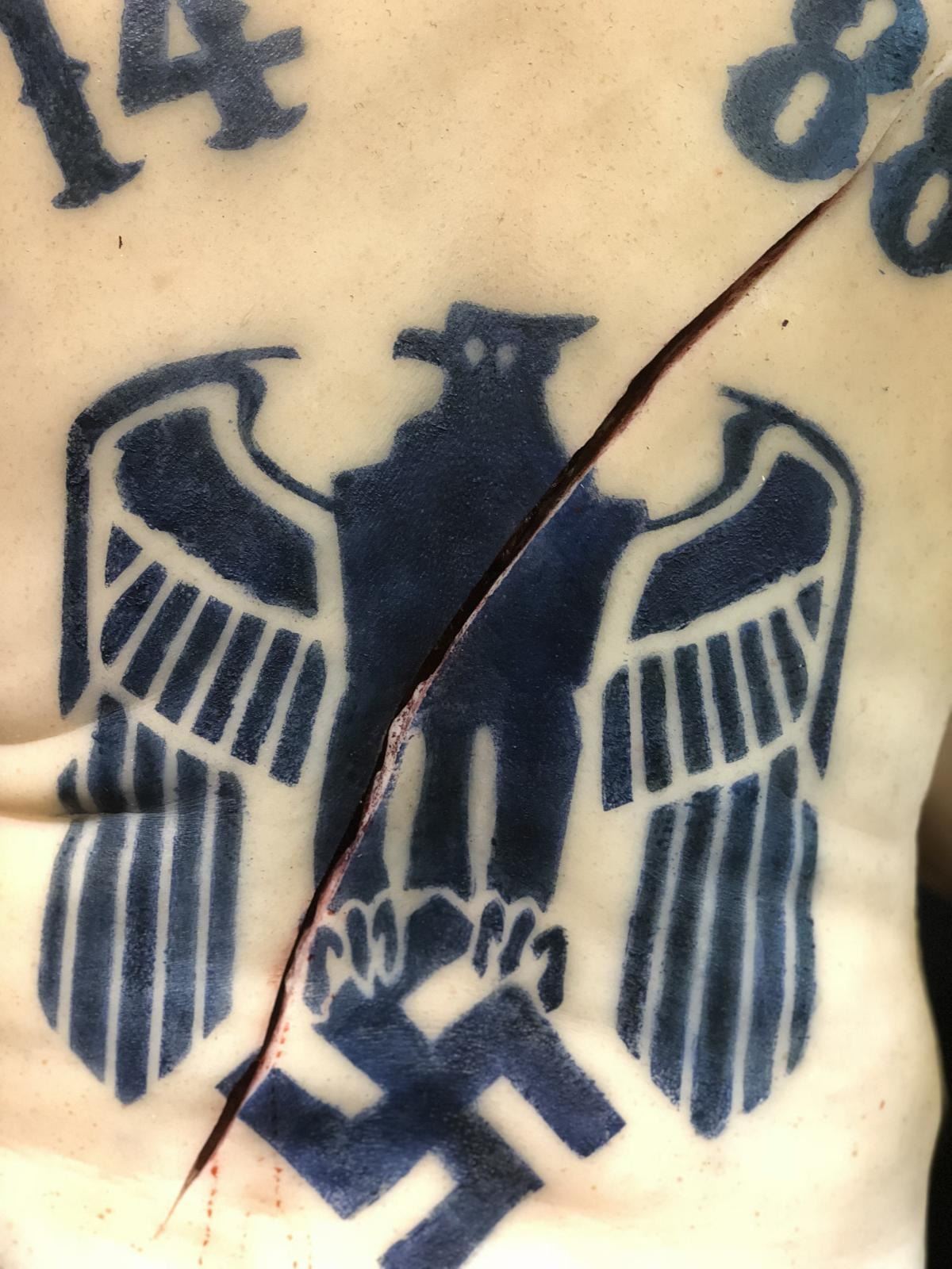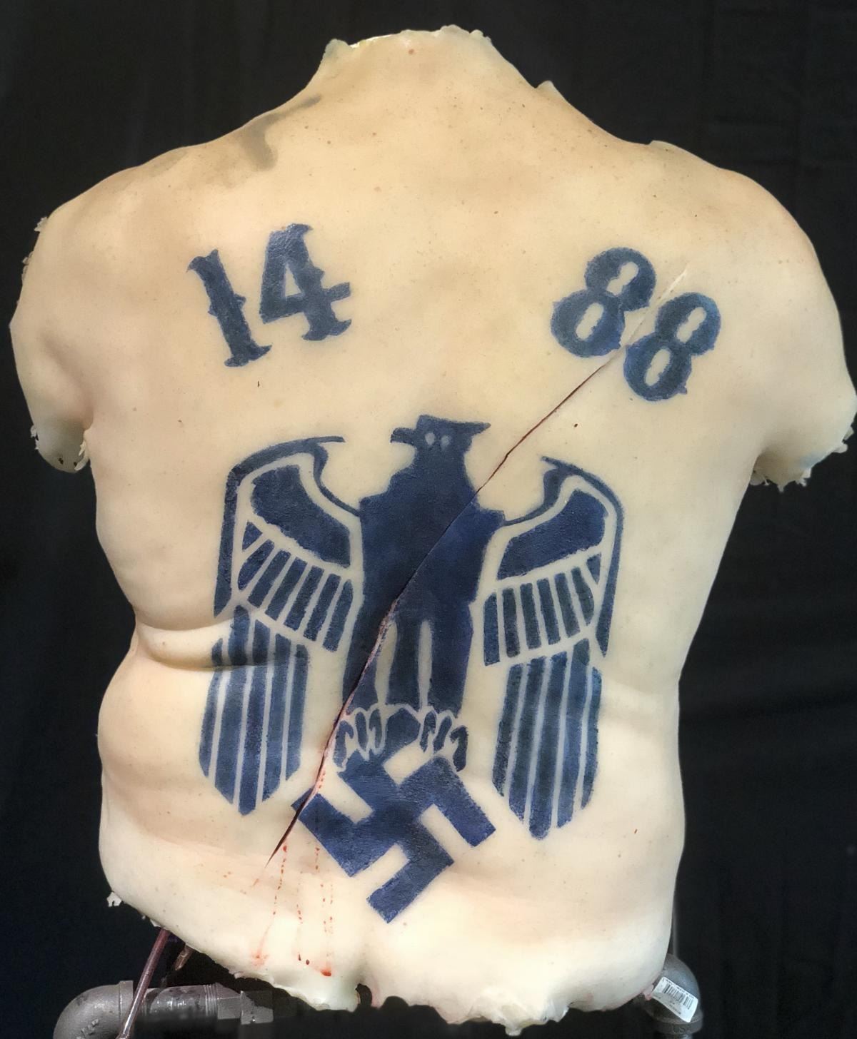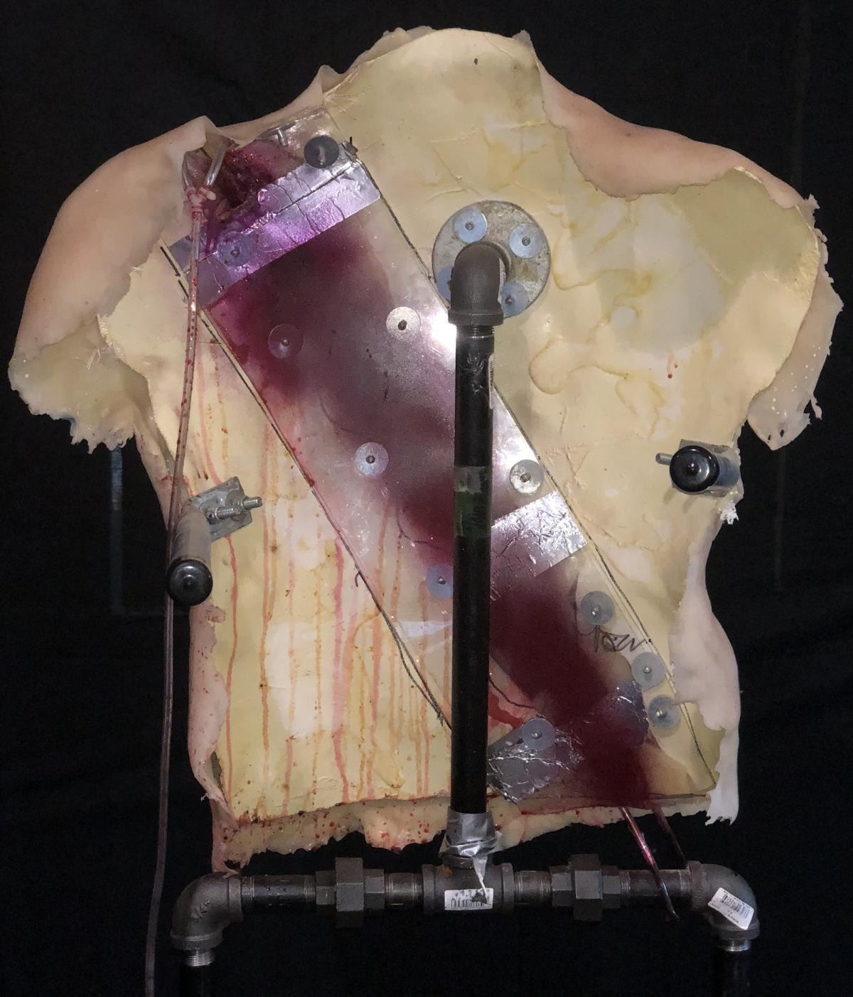 Original FX prop slashed back seen in the prison scene where Willem Dafoe slashes an inmates back. From the production of Dog Eat Dog (2016), the crime thriller movie about a crew of ex-cons who are hired by a Cleveland mafioso to kidnap the baby of a rival mobster.