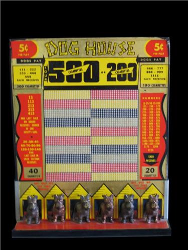 "Dog House" punchboard from the 40's unpunched with bronze "Scotty Dogs" all named in their doghouses as prizes