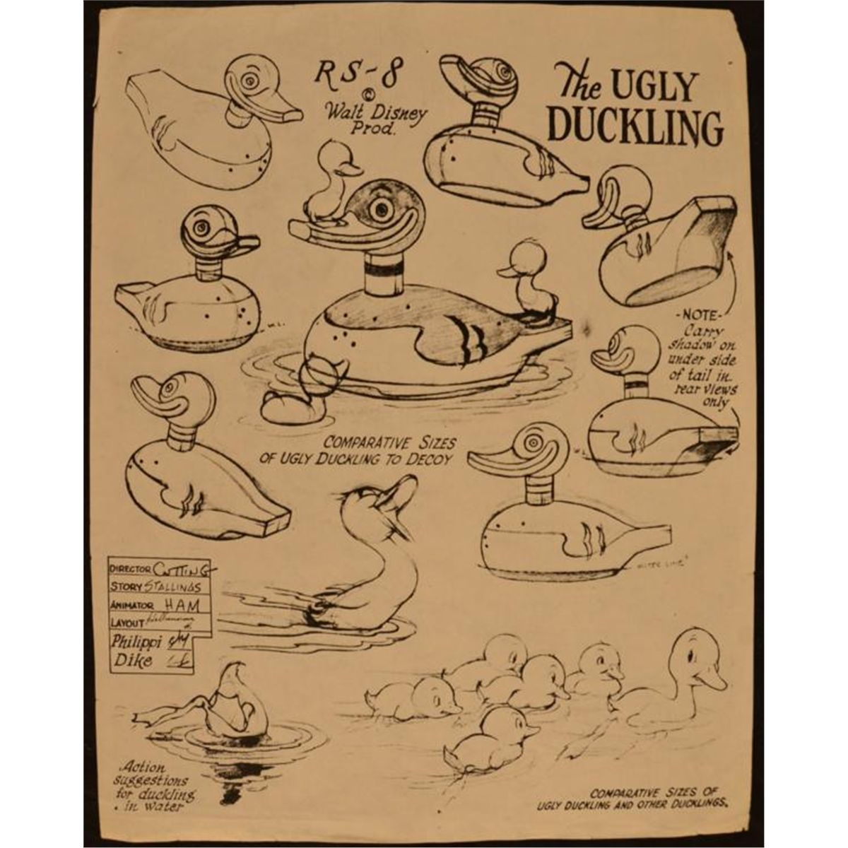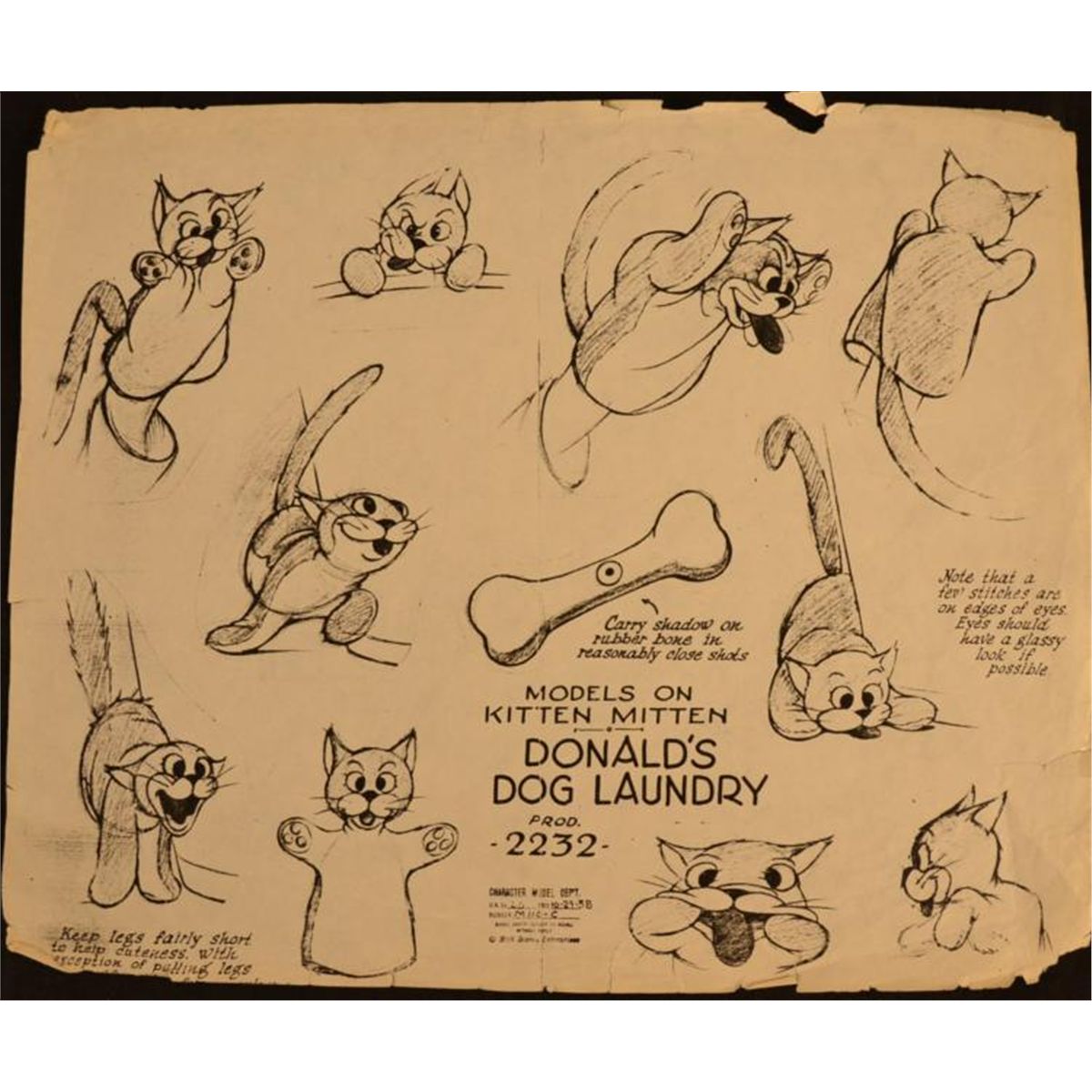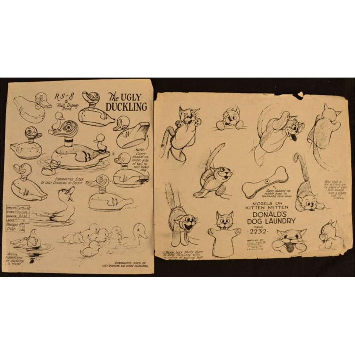 Here are two copies of model sheet drawings from two Disney shorts. One is titled Donald's Dog Laundry, from 1940, and it shows models on a hand puppet named Kitten Mitten. The other is from a 1939 short titled The Ugly Duckling, animated by Ham, and it features a duck decoy. * Medium: Print on paperSheet sizes: 10 x 13 and 11 x 13 1/2 inchesDetails: Lots of animator notes Disney stamp, and info.Condition: Very good condition, with crease marks and a few tears at the edges