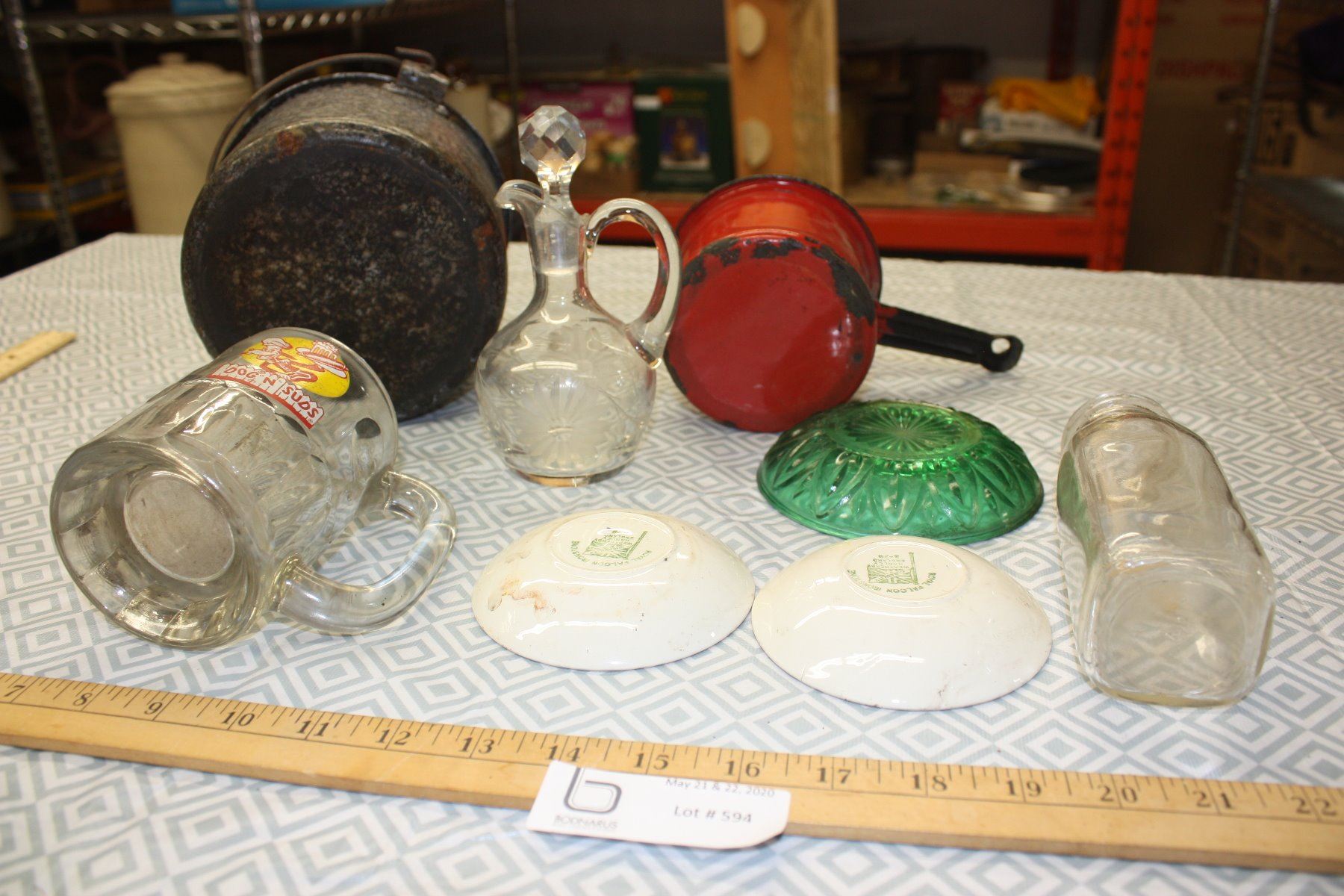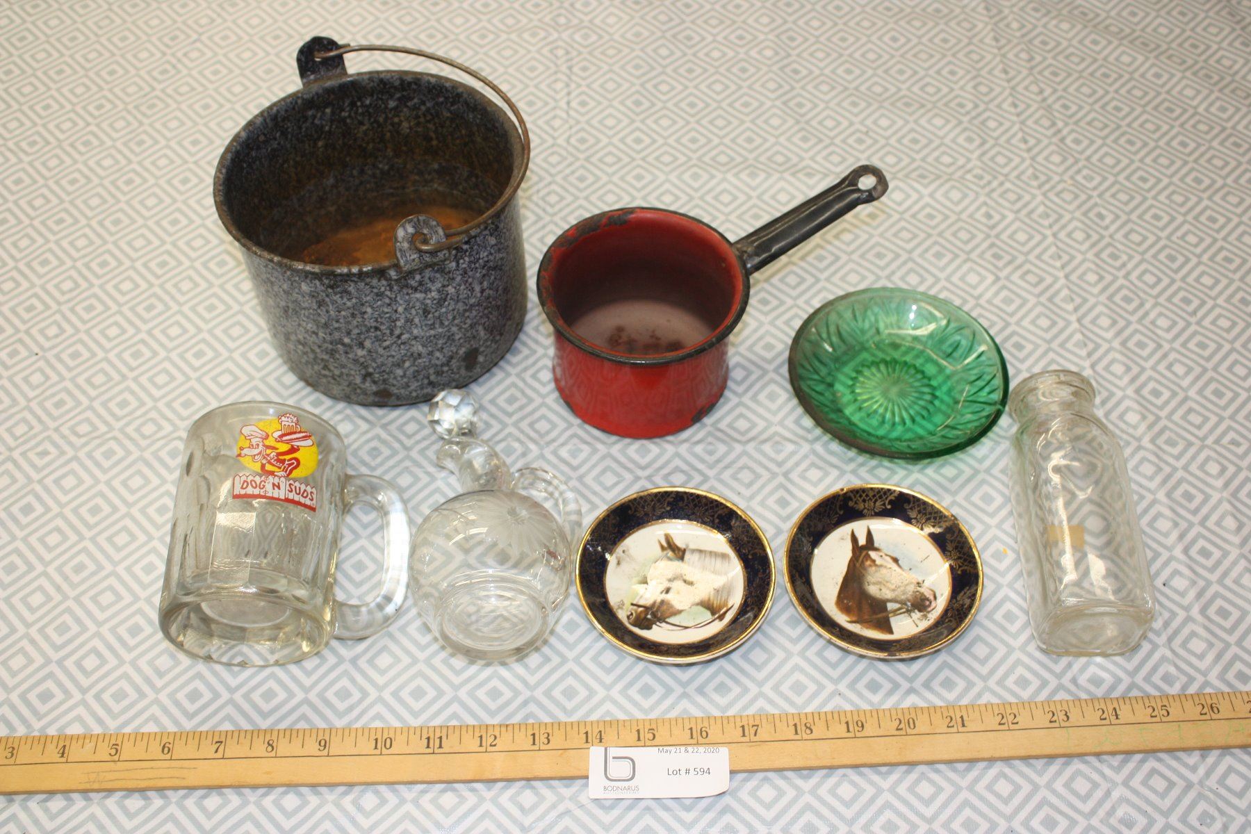 Dog N Suds Mug, Enamel Dipper and Pot, and Misc.