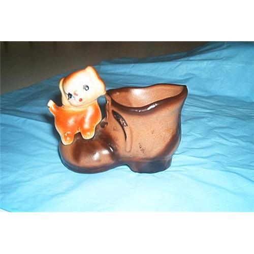 Featuring a Dog Setting on a Boot. (Haven't you ever seen a puppy do this?) The color of this boot is brown. The puppy is light brown. This boot measures 2 inches tall and 3 1/2 inches long. The puppy also has a white tip on the end of his tail. Beautifully detailed. This little fellow would look great on a shelf in your child's room or if your a dog lover, just collect him for yourself. He is adorable.