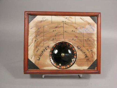 Dog Racing Roulette game "Whippet" - beautiful watercolor type painting of racing dogs. Push level on side to spin wheel. Ca. 1900, 11" x 9". Good cond.