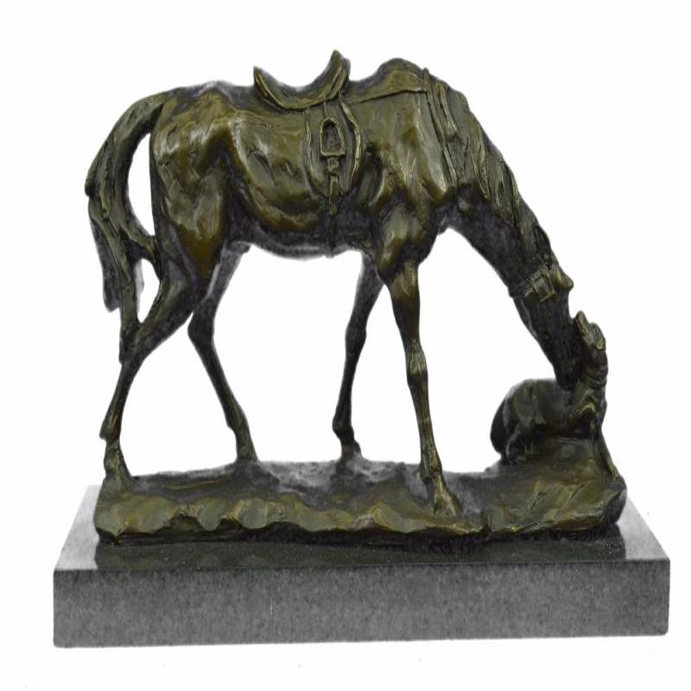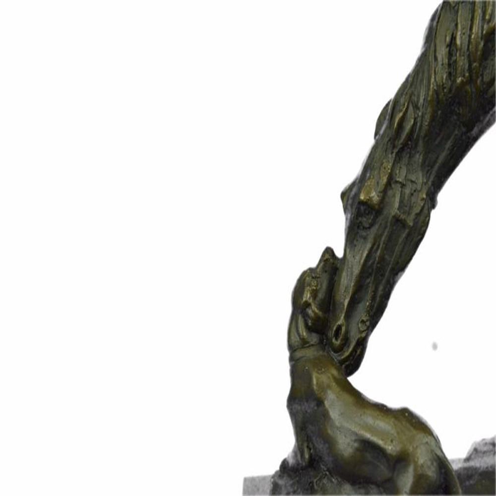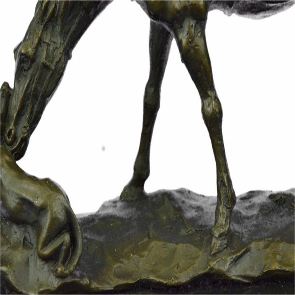 This Bronze Sculpture captures a typical day seen on a ranch or farm. We witness the beginning of a friendship, that forgets the borders of species and embraces curiosity. The saddled horse inquisitively lowers its head to come eye to eye with the herding dog who insecurely returns it is gesture assuming a position of submission to its much larger acquaintance. The artist craftsmanship skills come through in the powered muscles of the horse and the details of the horses mane. There is a general realness of the language and communication being relayed by both these species. The Sculpture was cast using the archaic methods of lost wax techniques and finished with a brown patina stain and is mounted upon a marble base. Dimensions: Height 9 X Width 14 inches. Weight: 16 LBS.
