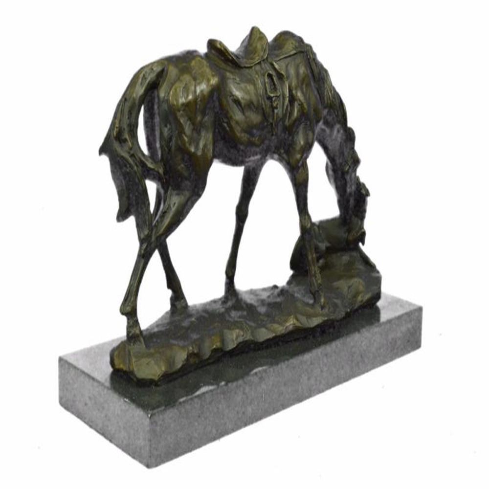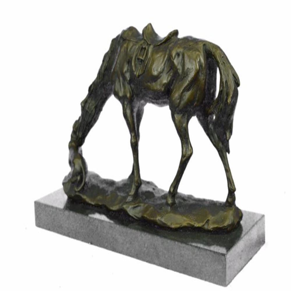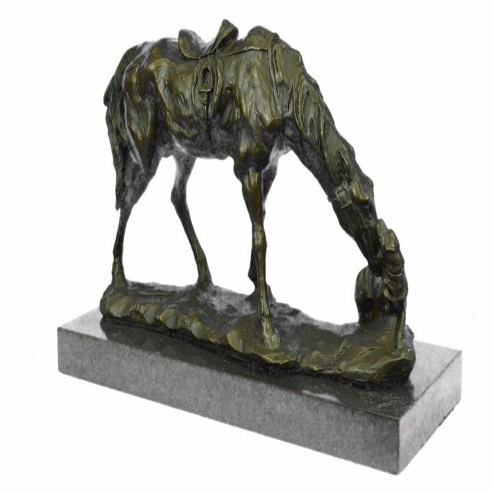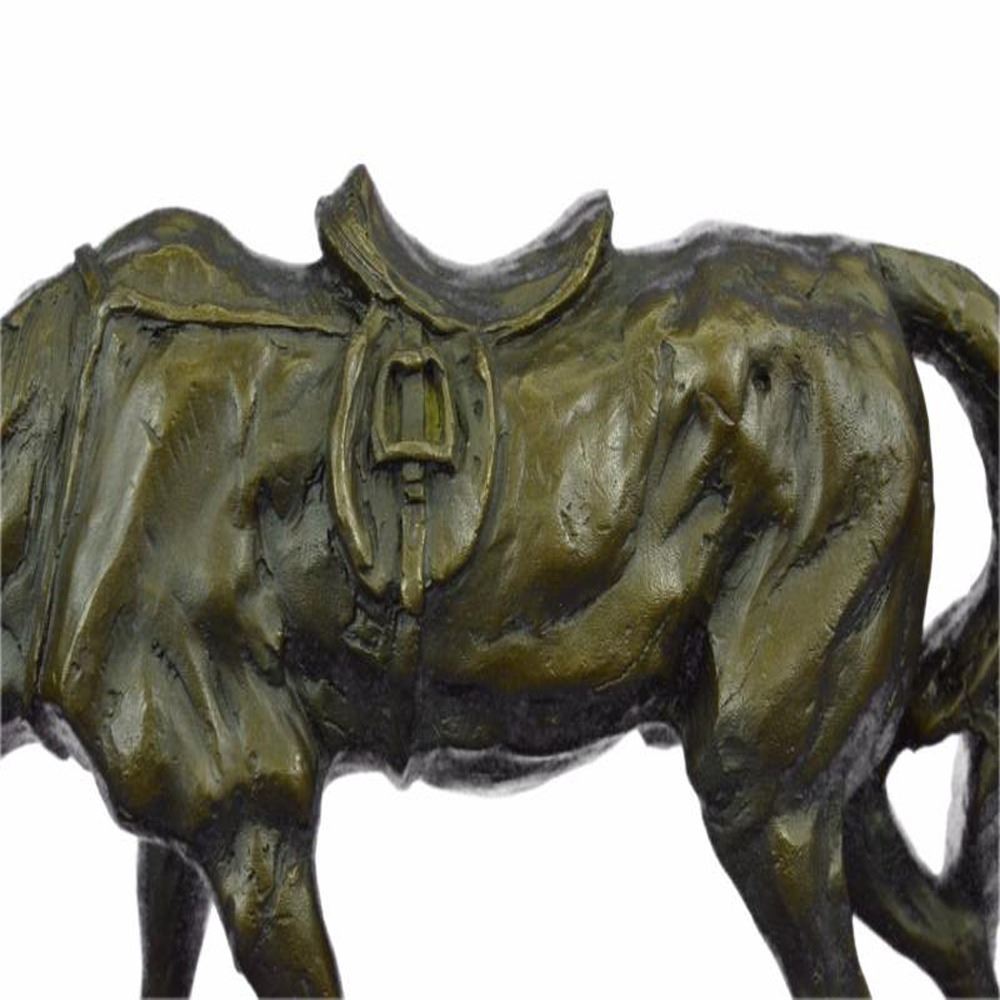 This Bronze Sculpture captures a typical day seen on a ranch or farm. We witness the beginning of a friendship, that forgets the borders of species and embraces curiosity. The saddled horse inquisitively lowers its head to come eye to eye with the herding dog who insecurely returns it is gesture assuming a position of submission to its much larger acquaintance. The artist craftsmanship skills come through in the powered muscles of the horse and the details of the horses mane. There is a general realness of the language and communication being relayed by both these species. The Sculpture was cast using the archaic methods of lost wax techniques and finished with a brown patina stain and is mounted upon a marble base. Dimensions: Height 9 X Width 14 inches. Weight: 16 LBS.