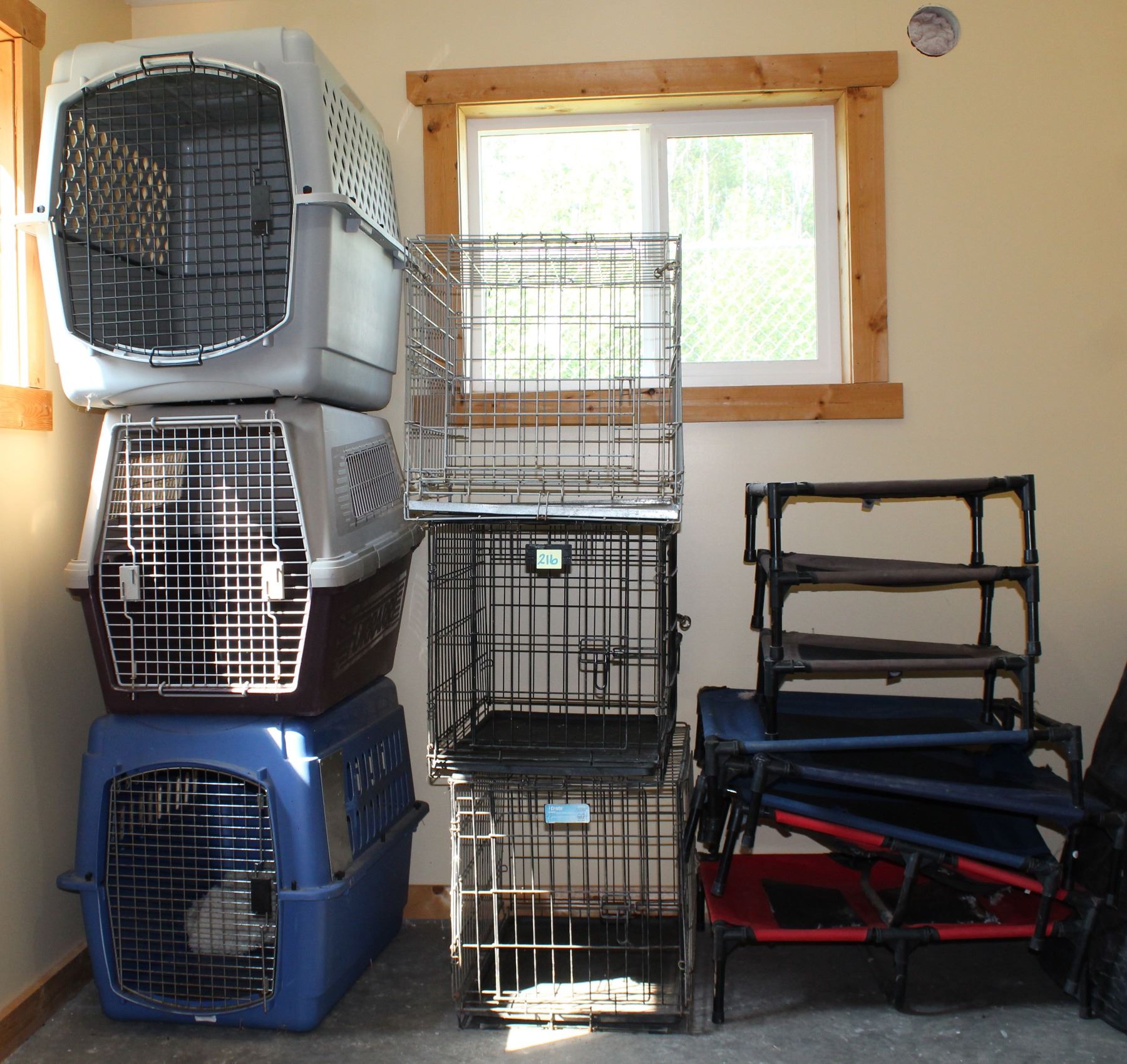 Dog crates 1 large, 2 medium, 3 wire crates, assorted raised pet beds.