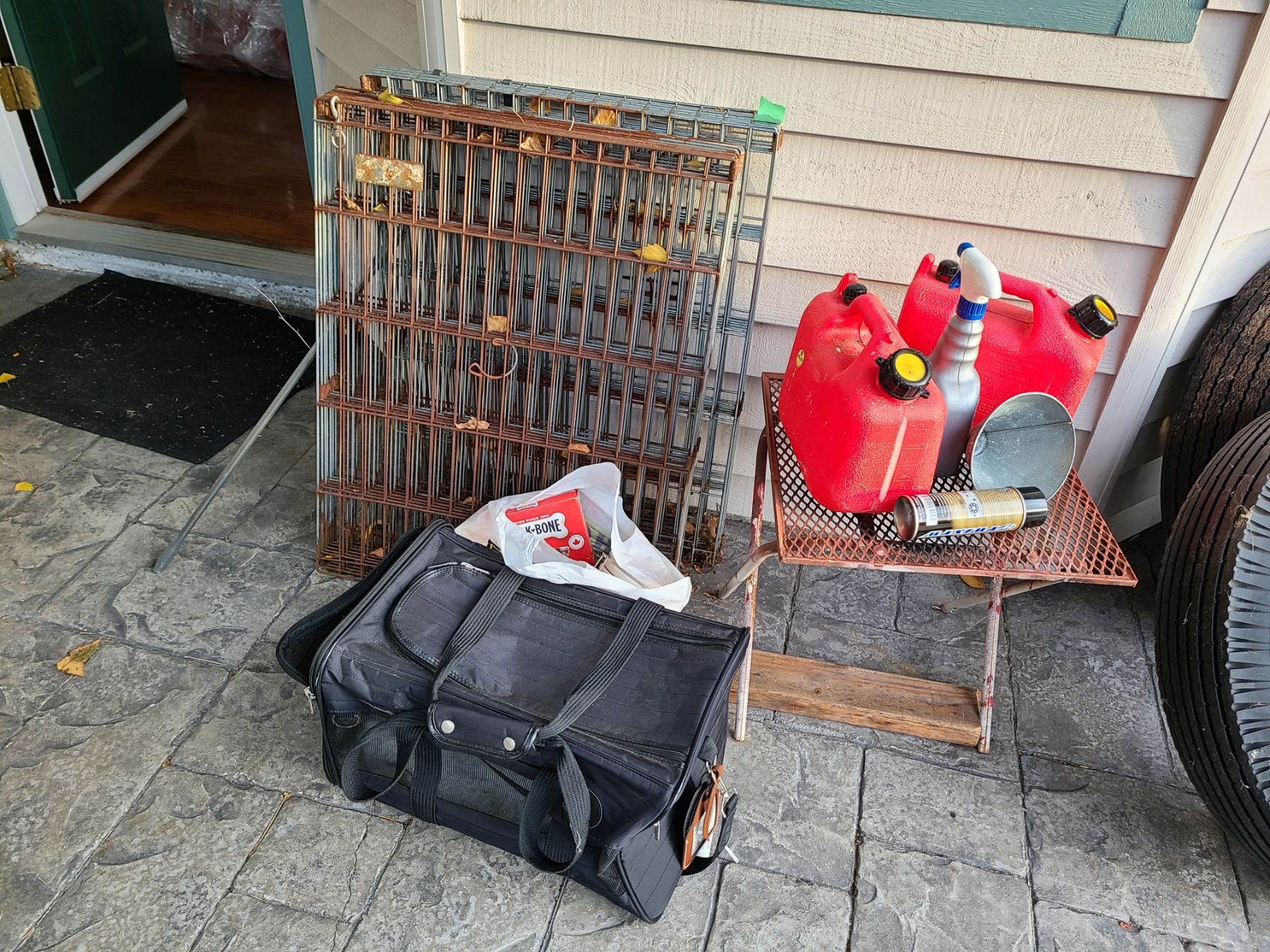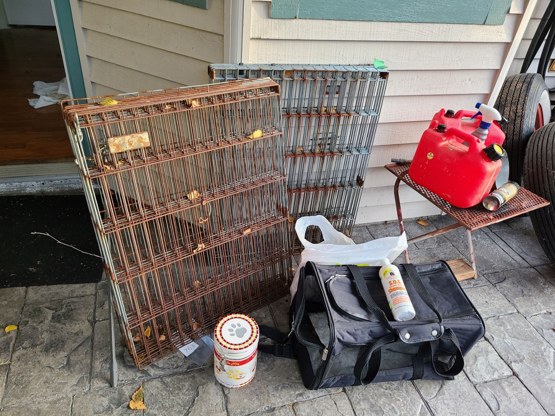 2 metal dog cages, pet carrier, and doggy treat barrel. Pickup at 11 am