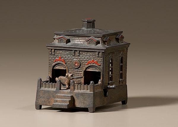 Connecticut, New York or Tennessee, ca 1880-1900. A cast iron dog on turntable, mechanical bank by H. L. Judd. Having the original copper with red surface; 5" high x 2.50" wide.