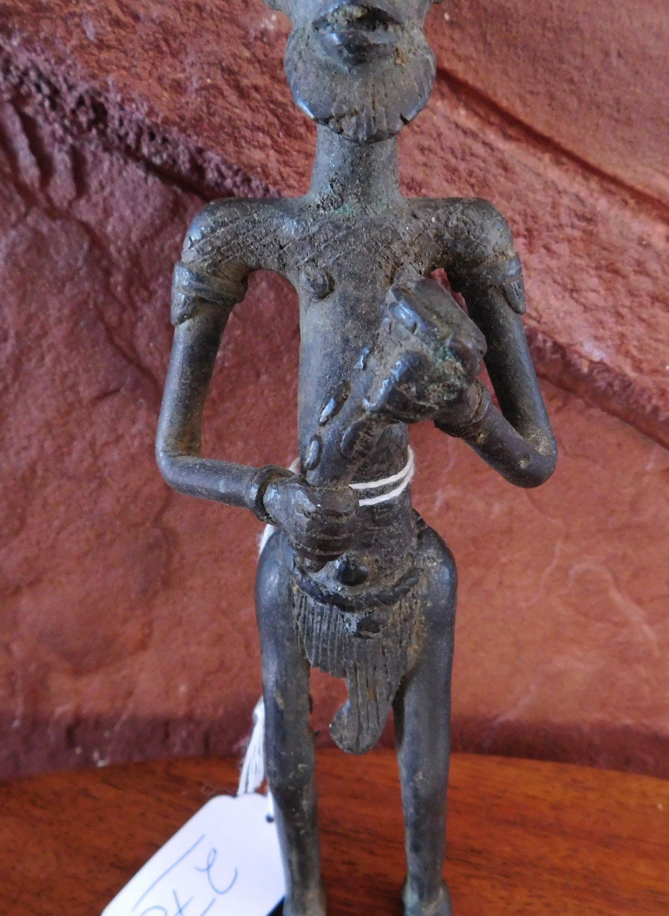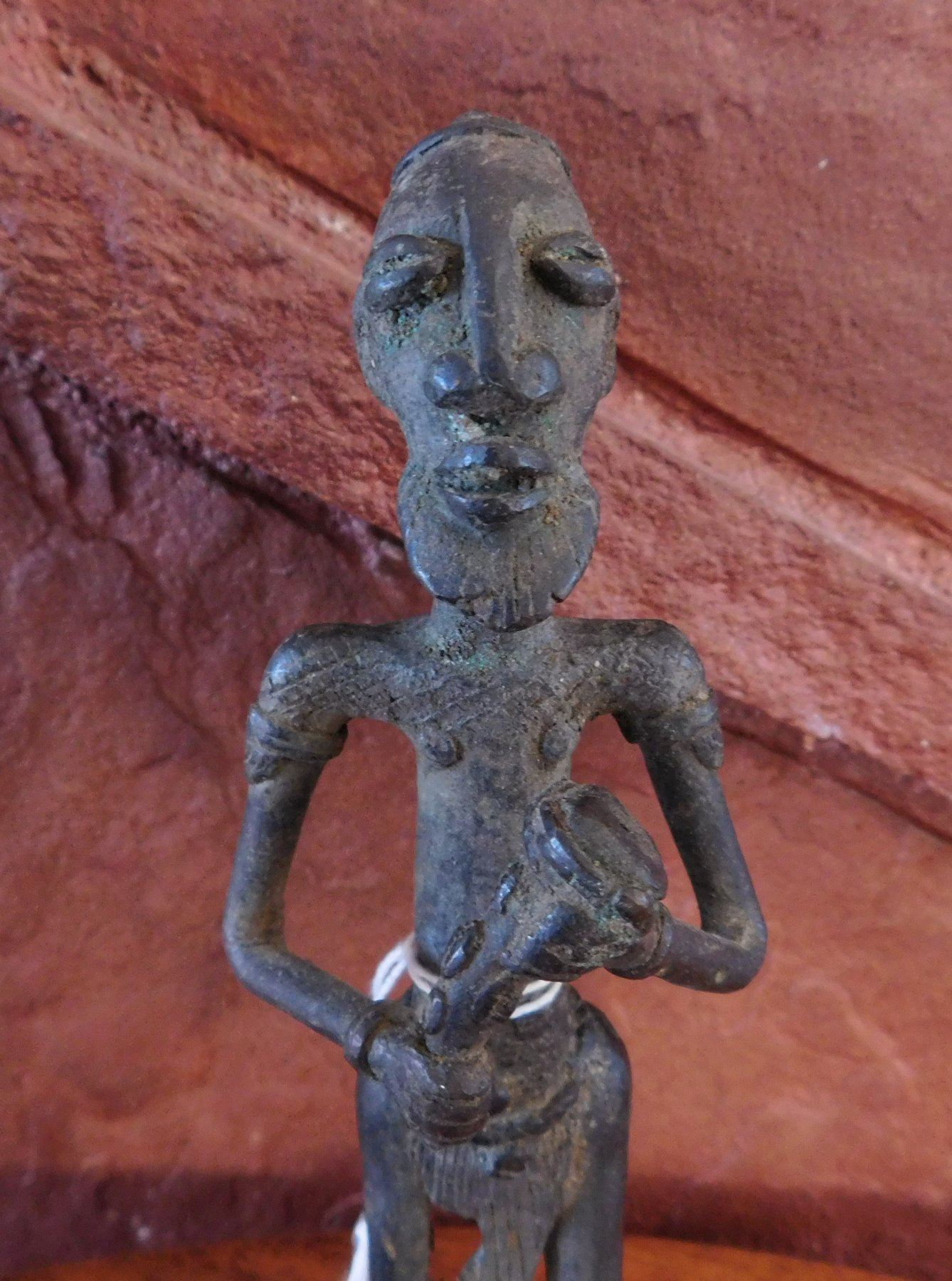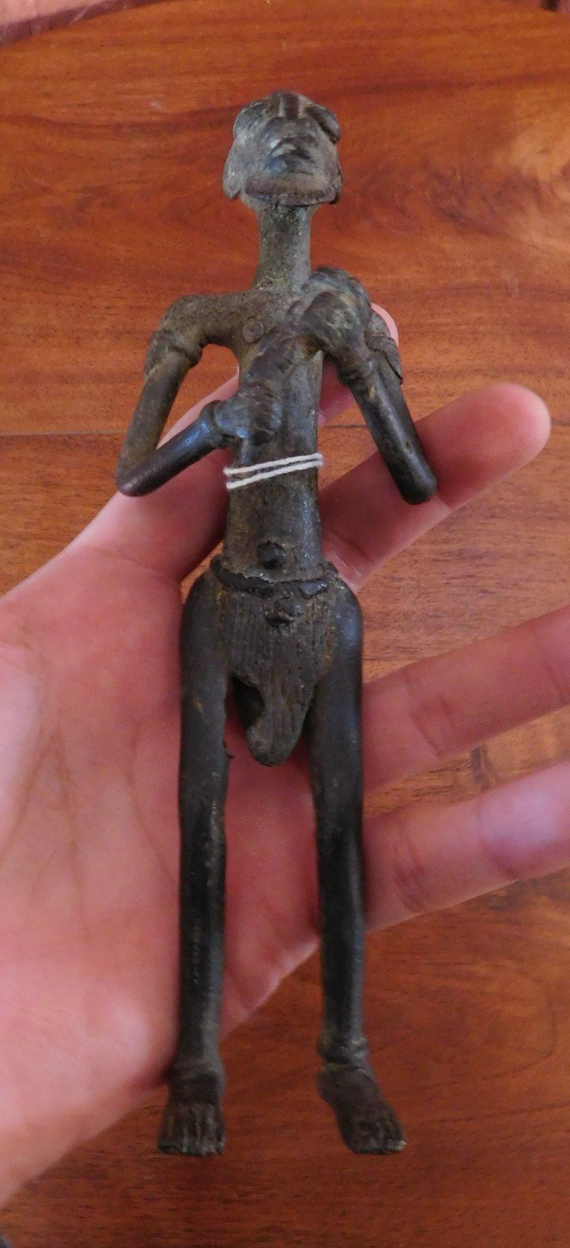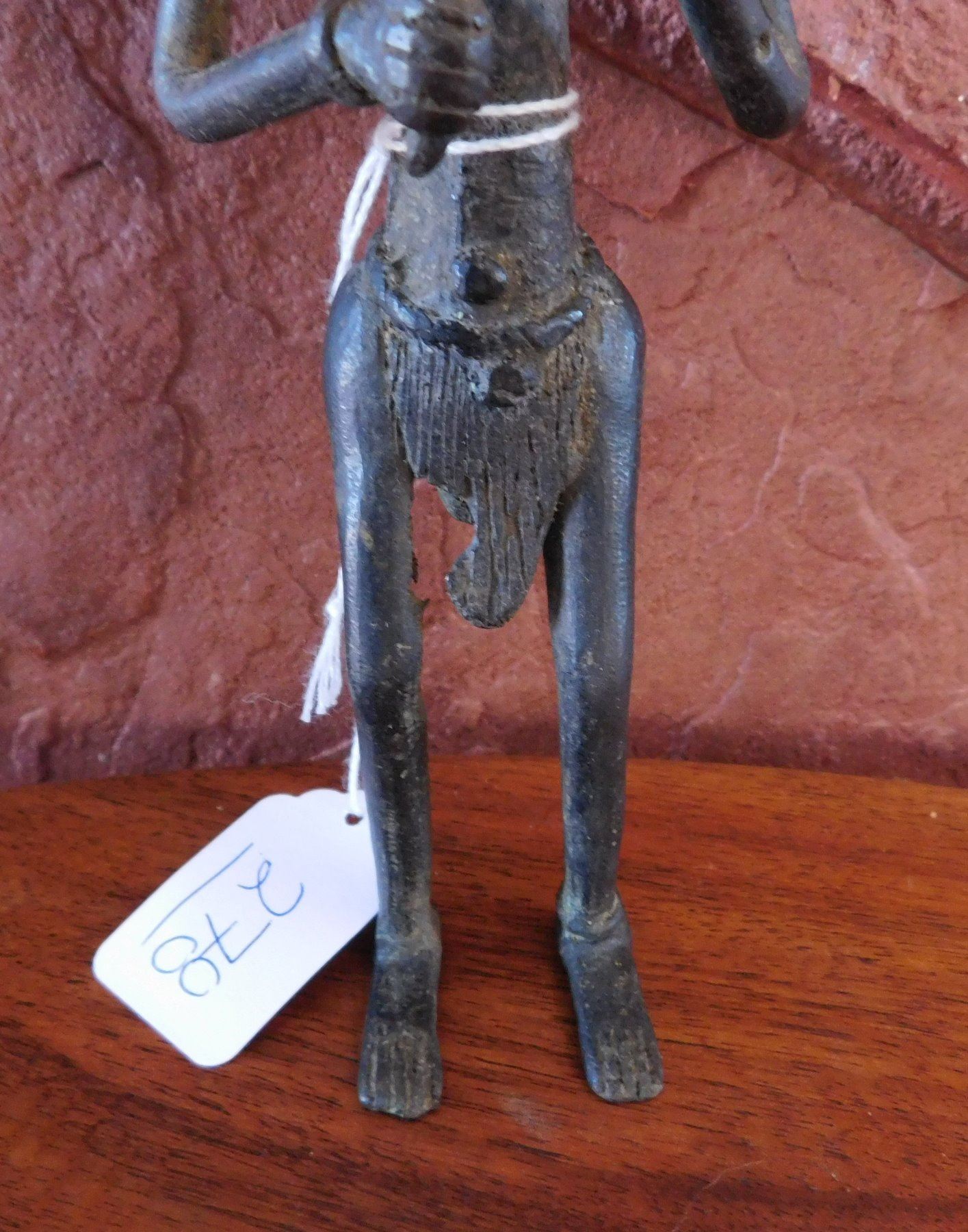 Dogon Man-Holding-Vessel Bronze, 18th century item.Made of bronze, this figure measures 7" tall. Mali. Condition: Good, breechcloth has minor damage, see images. Shipping: $26.50 w/insurance and signature.