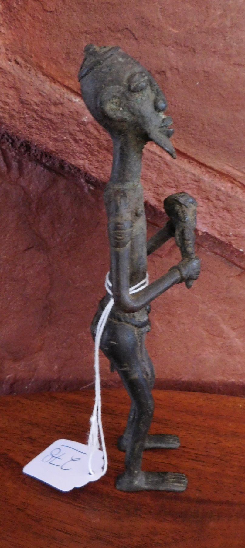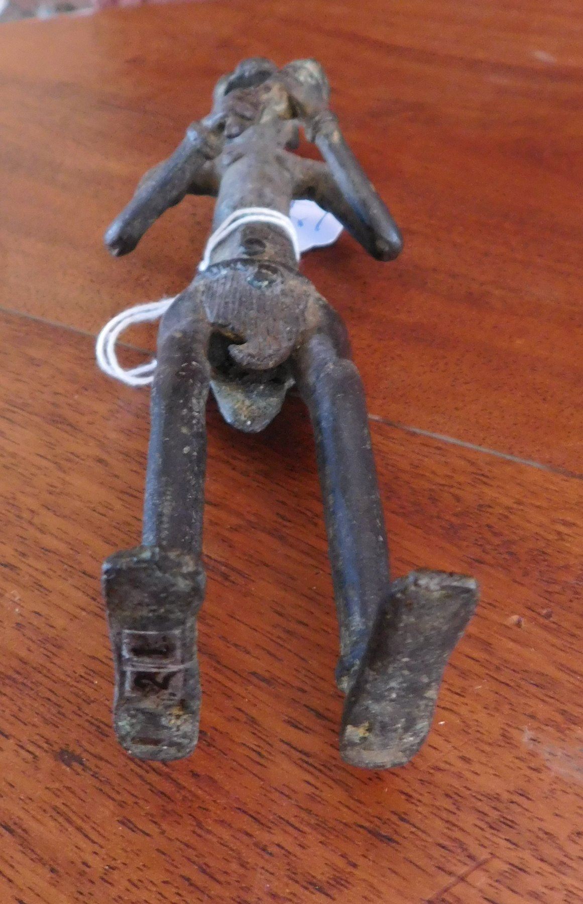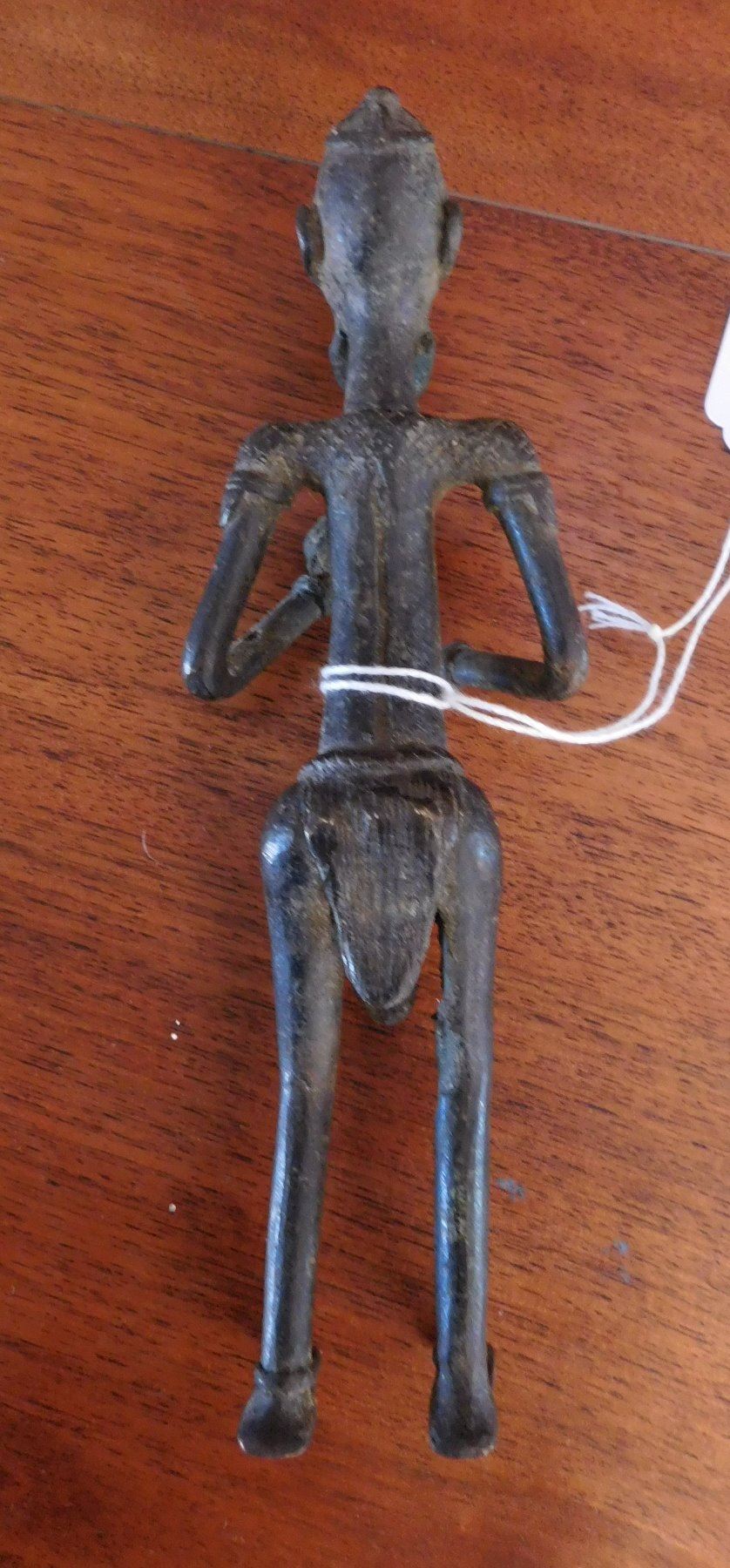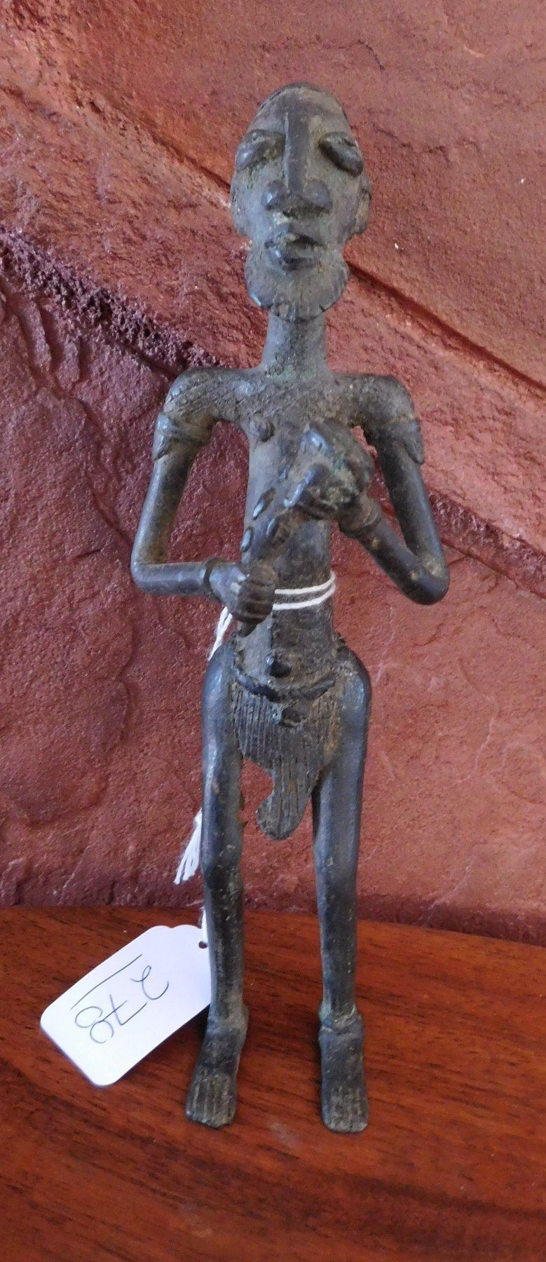 Dogon Man-Holding-Vessel Bronze, 18th century item.Made of bronze, this figure measures 7" tall. Mali. Condition: Good, breechcloth has minor damage, see images. Shipping: $26.50 w/insurance and signature.