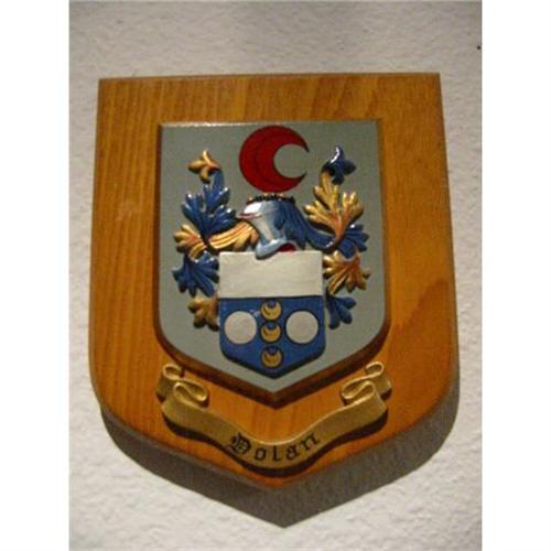 This 7 inch Icon or Crest is made in London " Great Britain" and is a Family History Icon for Dolan. It is handpainted on a wood and mounted on a light wood. On the back is labeled "The Black Knight Art Co. Historic Families Division Summers Row North Fincheley London N.12. England.on the plastic openning to post on the wall indicated Great Britain. This Icon is 6 inch wide and .5 inch deep. Collectible, decorative, Something to think about.