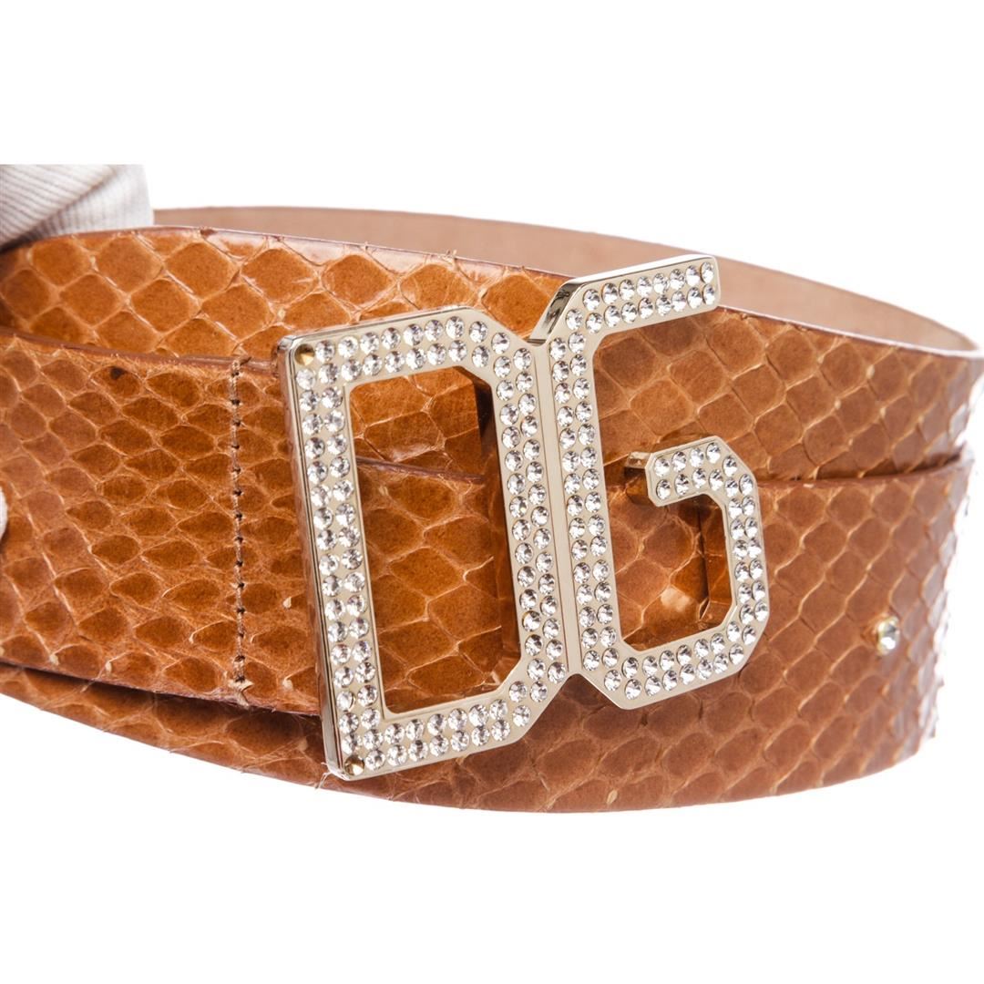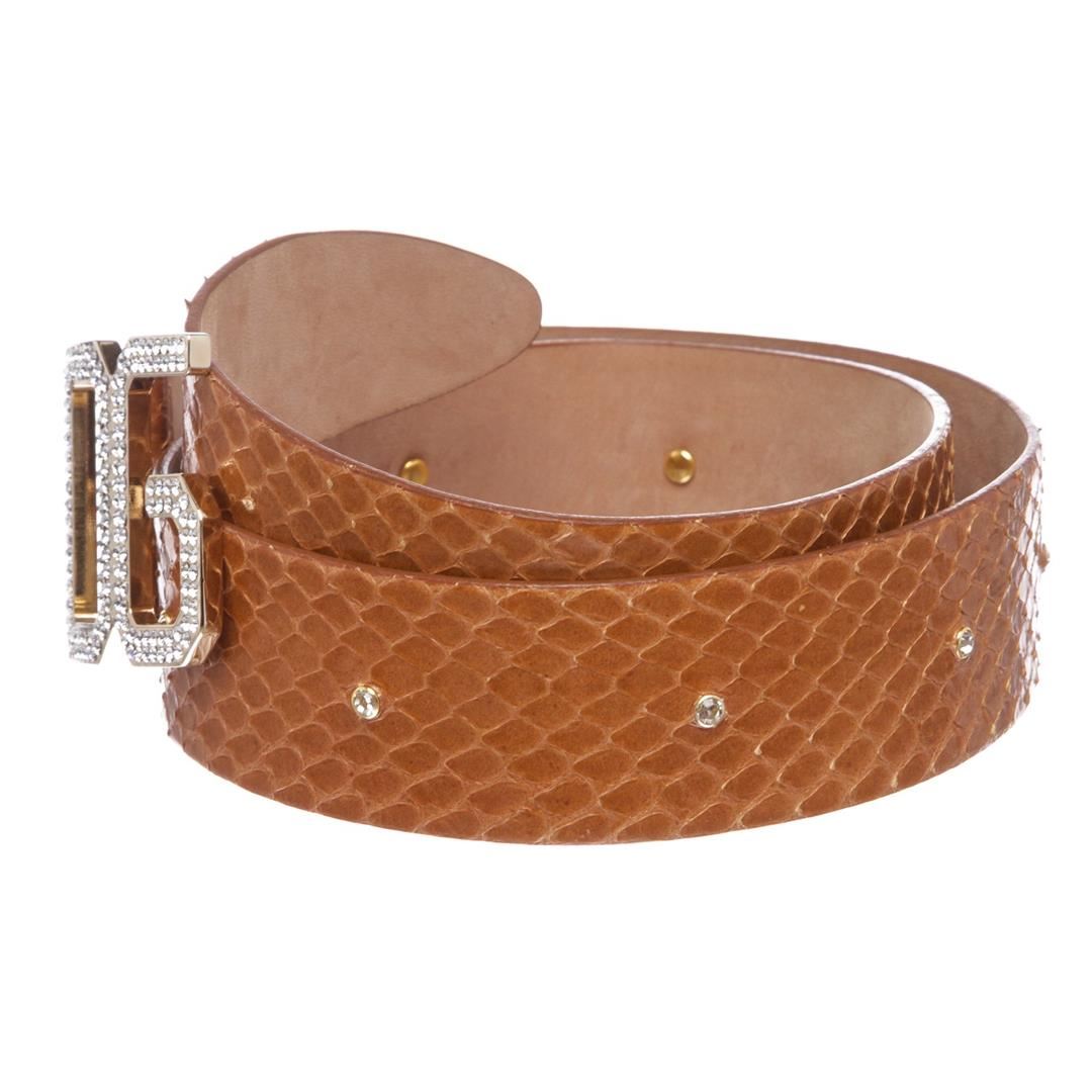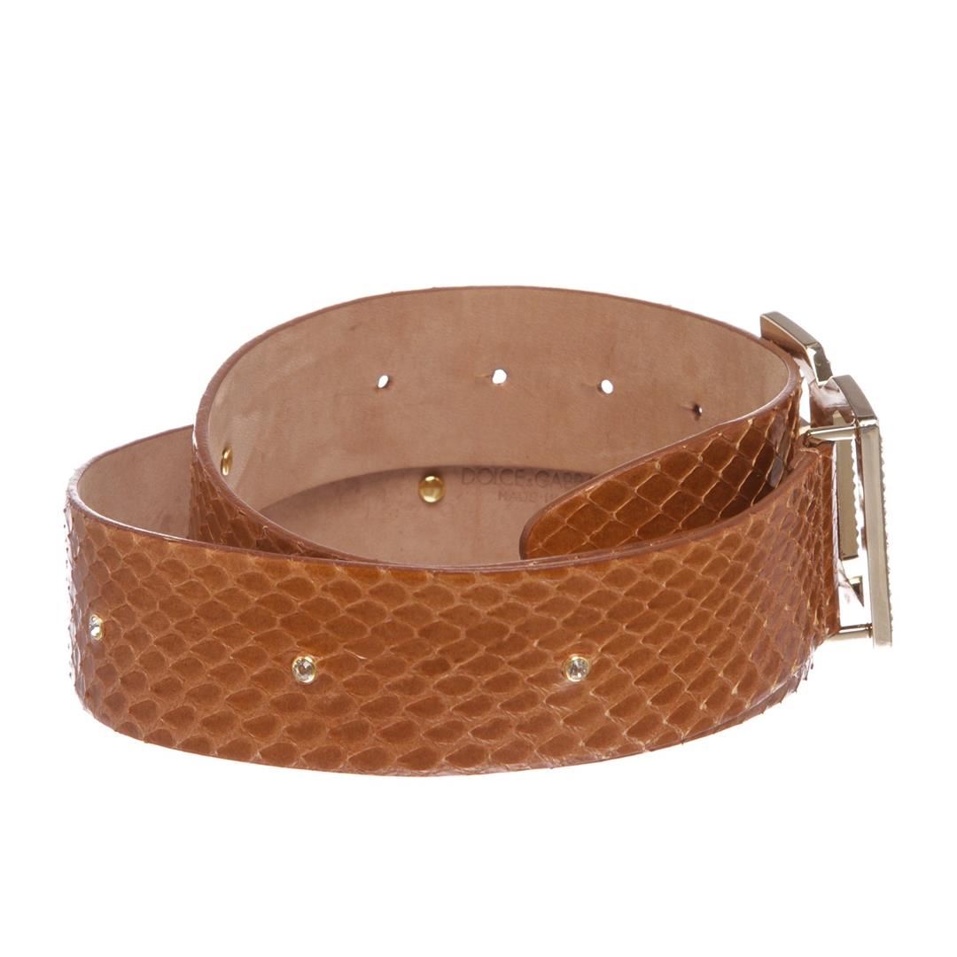 Dolce & Gabbana brown snakeskin belt with gold-tone rhinestone buckle closure at front.