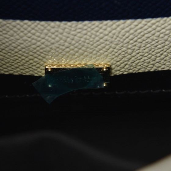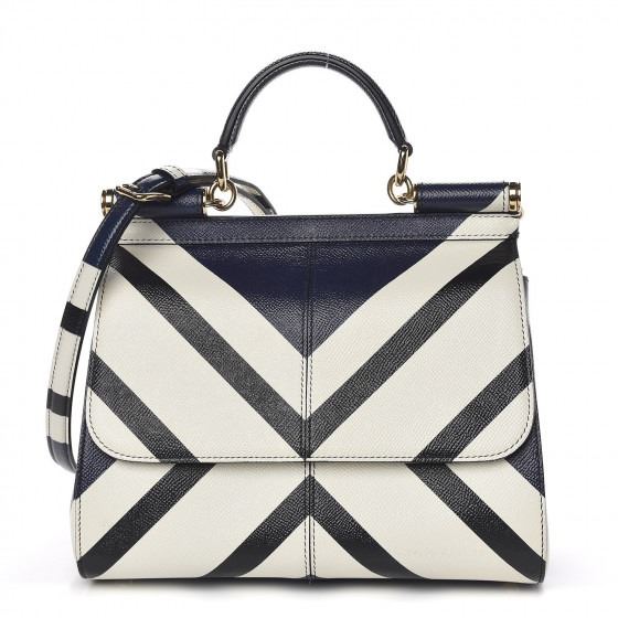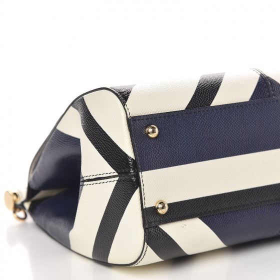 Blue satchel is crafted of luxurious white textured calfskin leather complemented navy blue stripes. The bag features a reinforced leather top handle, an optional adjustable shoulder strap, and gold hardware. The flap opens to a black fabric interior with zipper and patch pockets.