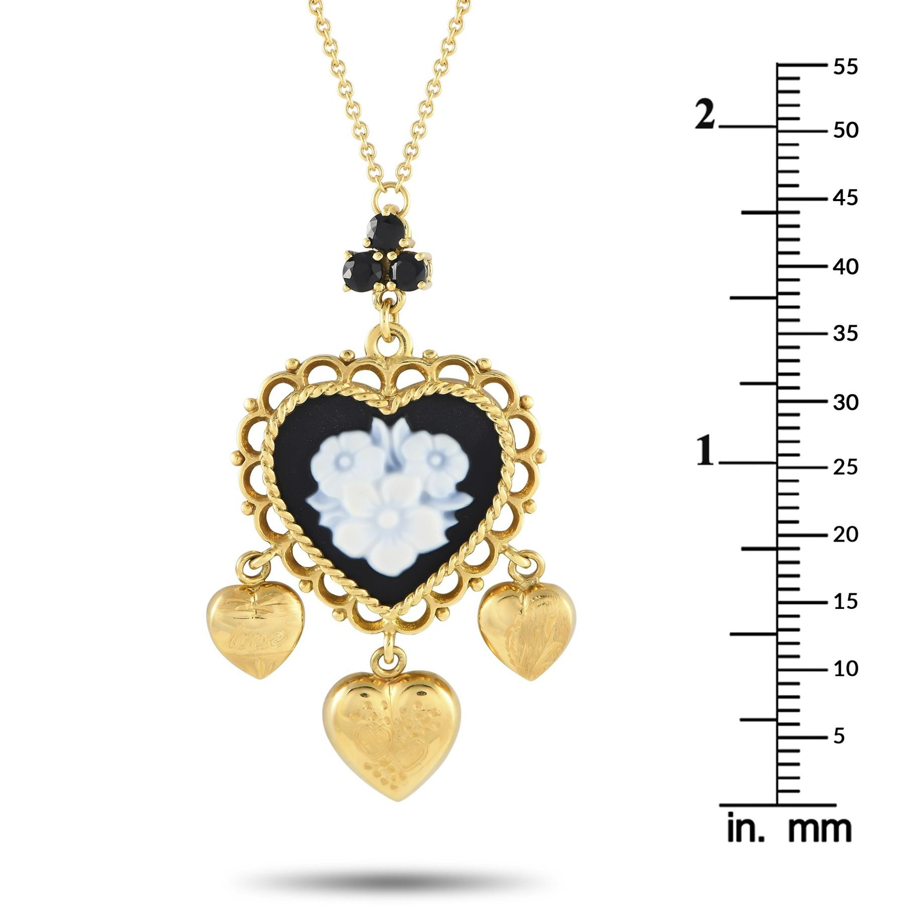 This breathtaking Dolce and Gabbana necklace is an elevated piece that exudes old world elegance. The 18K Yellow Gold heart-shaped pendant which measures 1.75 long by 1.0 wide comes to life thanks to ornate metalwork, floral motifs, Black Jade accents, and a trio of inset Sapphire gemstones. Its suspended from a 20 chain with lobster clasp closure. This jewelry piece is offered in estate condition and includes a gift box.
