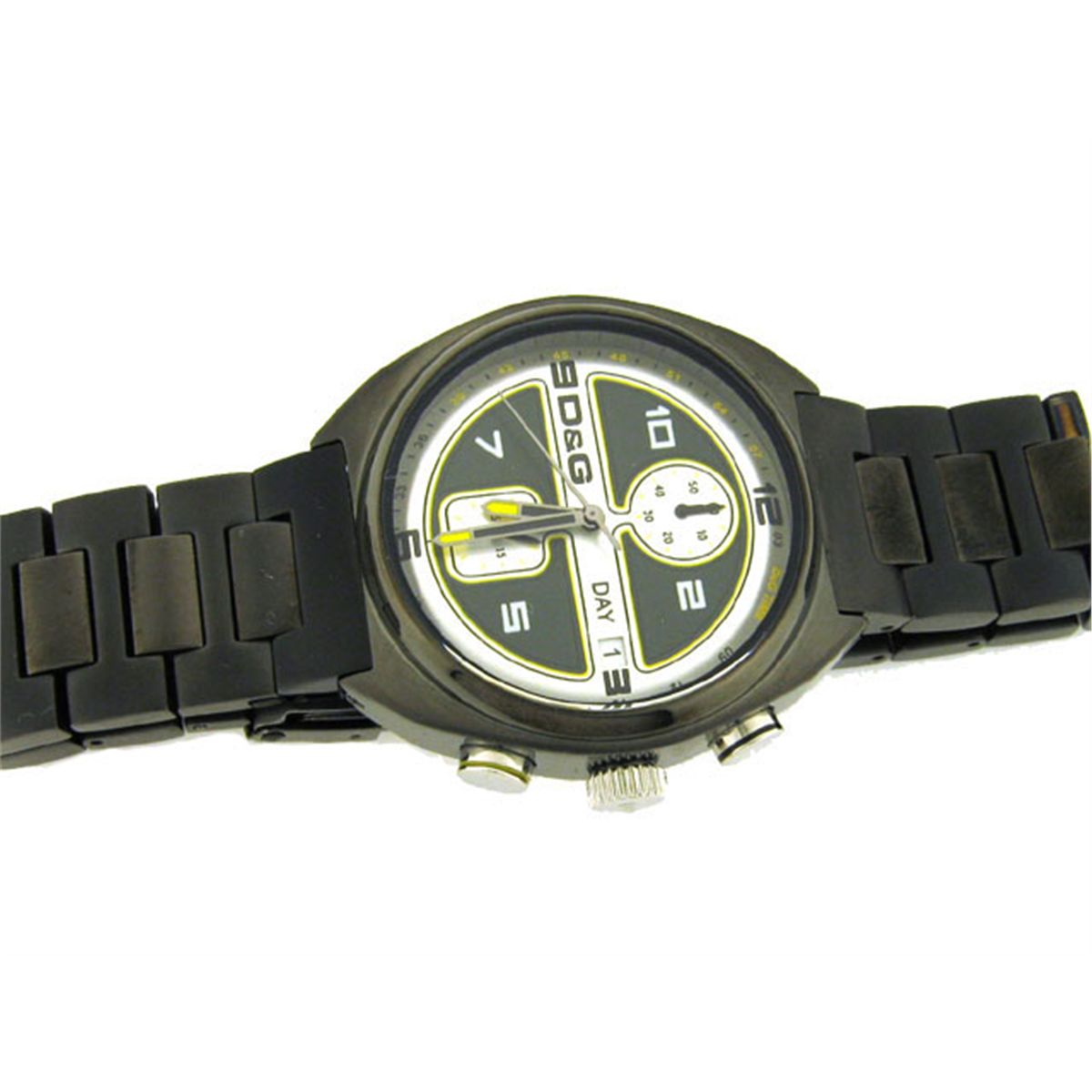 This is a Dolce and Gabbana Song Collection Chronograph Mens Watch DW0302 with the following features: Stainless steel case and band; three hand analog quartz movement; two multifunction dials and analog date display window; mineral glass crystal; fold-over clasp closure with safety; water resistant 50 meters/165 feet; case diameter measures 32mm W x 32mm H; case thickness measures 11mm Band; and band width is 20 mm.