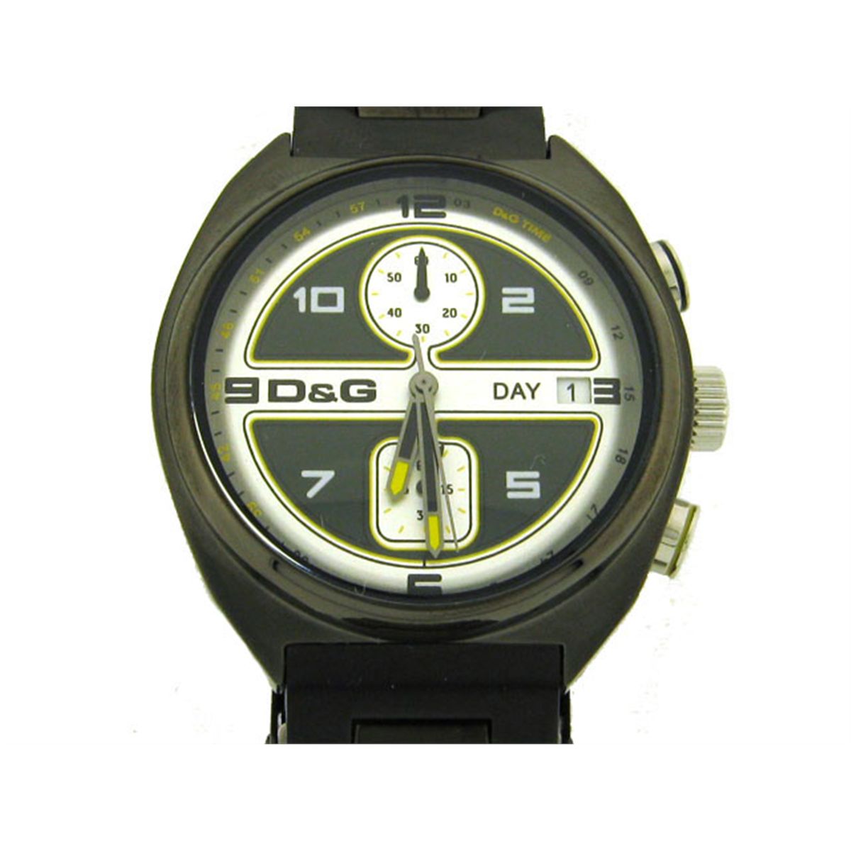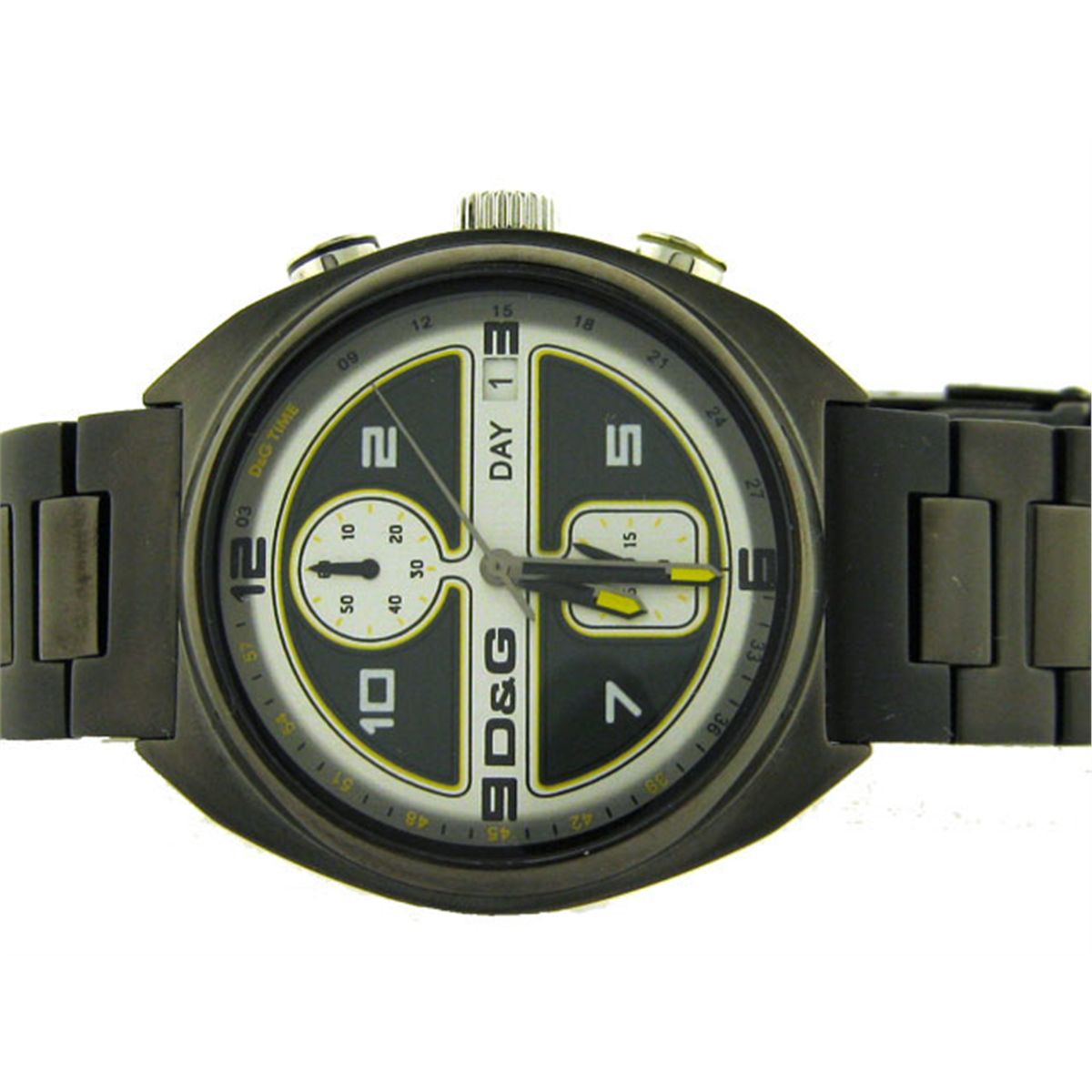 This is a Dolce and Gabbana Song Collection Chronograph Mens Watch DW0302 with the following features: Stainless steel case and band; three hand analog quartz movement; two multifunction dials and analog date display window; mineral glass crystal; fold-over clasp closure with safety; water resistant 50 meters/165 feet; case diameter measures 32mm W x 32mm H; case thickness measures 11mm Band; and band width is 20 mm.