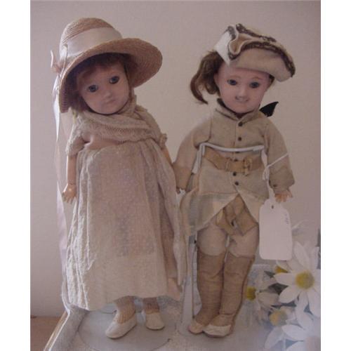 13.5" pair or dolls marked SFBJ Paris 9, ball jointed composition bodies, head is painted material, am not sure what it is. Inset eyes, wearing original clothing but some of the material is falling apart. She needs to be restrung for sure. She has a crack on the inside seam of the right leg and some composition off the top of the bottom part of the left leg. The leg is two parts, no ball joint at the knee like the German made dolls.<P><P>Got questions, email before you bid.