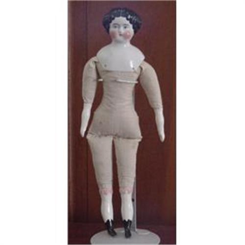</font></strong>15" white china head doll made in Germany. The head is vintage, is called a flat top hair style, has some paint rubs, no chips or cracks. Has two sew holes. It is on a older body but not as old as the head, newer arms and legs. The head is 4" tall and 3.5" across at the widest part.