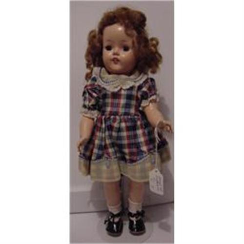 15" HARD PLASTIC WALKER DOLL marked 170. She has open and close sleep eyes, open mouth with teeth. She has a saran wig. Looks like original dress and undies, replaced socks and shoes at sometime in the past. She has separate fingers and the hard plastic material looks like it has changed on the hands. There is no color on it. I think it is the compound of the material it is made of that has changed over the years. The doll is from about 1953, she his a walker and her head turns when her legs moves.