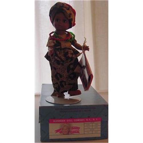 8" hard plastic, AFRICA by Madame Alexander, wrist tag has been tired on and there is no date. The doll has a slight old mess to her. Eyes do not open and close freely. Original box but name and number is rather faint on the box.