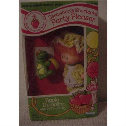 This the Strawberry Shortcake Party Pleaser Apple Dumplin with Tea Time Turtle still in the original box from 1983. The tape has not been cut on the box, so never opened. There is a little dust on the cellophane and it is a little pushed but not cracked or broken. Stock number 29180. It says on the box that there is a special Thank You Card Included. <P><P>Shipping is $7.00, covers shipping, handling and insurance.