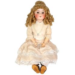 Doll, Armand Marseille, Queen Louise #100, bisque socket head w/open mouth & sleep eyes, composition body, beautiful replacement wig, very nicely dressed, VG+ condition, c.1910, 24.5"H.