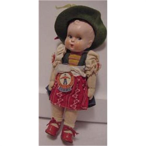 7.5" hard plastic head with painted features, molded hair, on cloth body. All original clothing and hat, has a paper chest tag, SCHERZ-PUPPEN AUSTRIA TIROL.