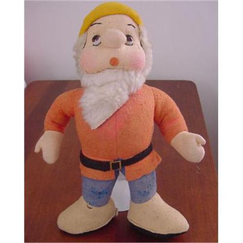 12" cloth felt Bashful Dwarf from Snow White and the Seven Dwarfs. He has been displayed and has faded, has some soil and dirty but would still look cute with a Snow White doll. He does have some moth holes. There is a little folded tag stitched on the back of his shoe with probably who the manufacturer was but it is faded now and can't be read.