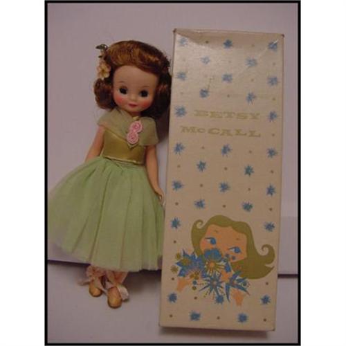 This is a vintage 8" Betsy McCall Ballerina Doll made in the 1960s by the American Character Doll Co. Her box has the name Betsy McCall on it with a face of a girl with a bouquet of flowers. End of box is only marked 8" in pencil next the the word BROWN and the B840 is written on the lower edge of the end of the box. Box has a little wearing and rubbing and a little crushed in left top corner, still very nice. Doll looks fabulous, face appears to still have that factory fresh look with hair in place and even the little clips in place with the flowers under the one clip. Eyes do open and close on their own. No unwanted smells, cracks or splits. You can see a little dark glue around the edges of the ballet slippers. No cheek scratches, etc. A really wonderful example of this doll. The hair is not the short wig but the nice longer fuller curled wig. <P><P>Email with questions.