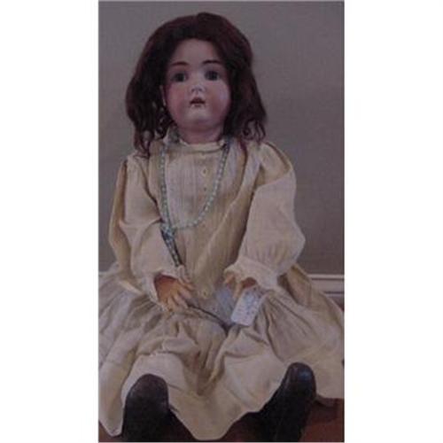 28" Kestner 171 ball jointed body bisque doll, original mohair wig. Marked on the back of the head made in L 1/2 Germany 15 1/2 171 . The ball jointed body is really nice, is stamped in red ink GERMANY with number. Great old clothing and shoes. Clothing needs to be freshened and it is dingy, hasn't been washed in years and years. You get the dress, full slip, half slip, knit undershirt, pantaloons, (these do have a tear in the back on the lower leg and some rust or dirt spots.)One finger on the left hand has been poorly redone. Original finish on entire body. Head has blue open and close sleep eyes, am sure they have been reset, open mouth with teeth. You get the plaster pate with the old mohair wig too. No damage, cracks or chips to the head.