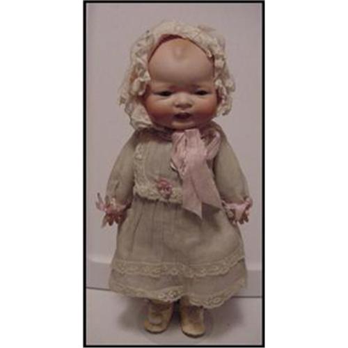 15" bisque baby doll, head was made by the Kestner Co. for the Century Doll Co. Lovely doll with solid head, open and close sleep eyes, wax is off the lids, open close mouth with two upper teeth painted on and little bisque molded in tongue. Head is a flanged head with a cloth body. Composition hands, the right hand has cracking of the compo. All fingers are there. Clothing appears to be original, bonnet has probably been added as it is pink and the dress is blue. The dress has a few holes. This little doll is just so darn cute! Marked on the back of the head, Century Doll Co. Kestner Germany.