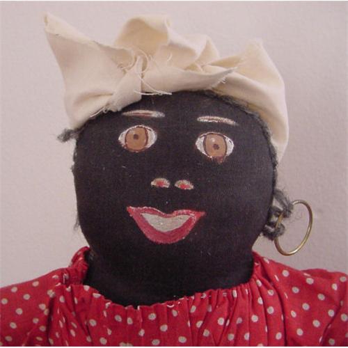 <table width="100%" border="0" cellspacing="0" cellpadding="4"><tr><td><em> </em></td></tr><tr> <td width="100%"> Probably handmade 1940s Black Cloth doll, stands 12" tall. The head is made with the body, and the arms are to the hips and not jointed. It is firmly stuffed. Painted features, has gray yarn hair just around the edges but it is almost all worn off now. The material for the bandana is falling apart. Has only one earring. No holes, unwanted smells, etc.<P><P>Email with questions.