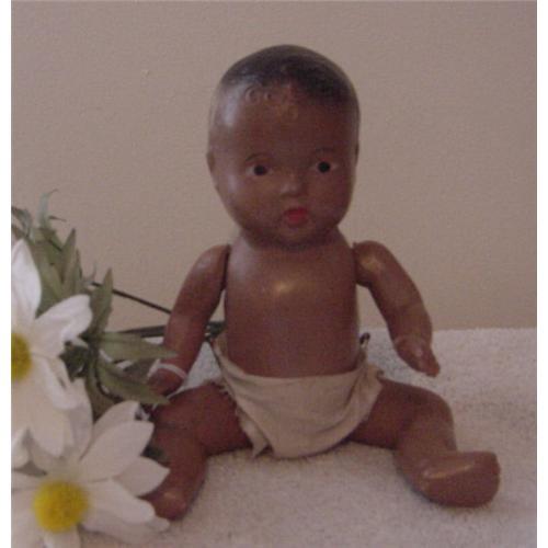 9.5" Black composition baby, unmarked, jointed at the arms and legs. Painted features, original rubber band stringing, a little loose. They used two different style arms on this doll. Has been played with but light wear. <P><P>Got questions, email before you bid.