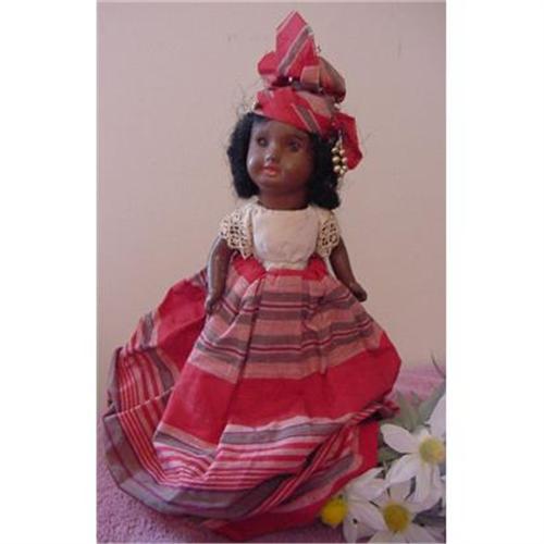 12" black doll with painted plaster type head with set eyes. There are some letters and numbers on back of head but I can not read them. I think she was from the 1950s or 60s. Made like a bisque head doll. Body is not a balljointed body. <P><P>Got questions, email before you bid.
