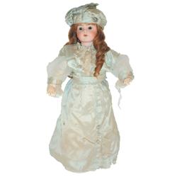 Doll, Bru Jne R Bebe, bisque socket head marked Bru Jne R-9, wood & comp. jointed body, paperweight eyes w/exceptional detail, pierced ears, open mouth, an exceptional doll in Exc. condition, period satin dress shows wear, 22"H.