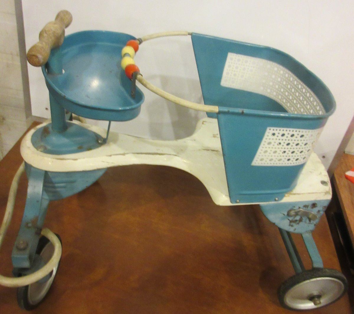 Vintage metal doll buggy circa 50's 60's, vintage 1940's 50's baby walker and a child's table with metal legs and believe arborite top