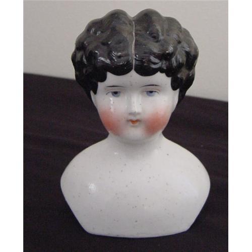 4" old 1900s white china head doll. It is just the head, measures 4" tall. Has a white center part, rosey cheeks, red line above the blue eyes. There is alot of peppering on the head, little impurities in the firing oven. A little rubbing on the back of the head on the black paint. Marked #3 on the back of the shoulder plate. <P><P>NO PAYPAL, I can process your Visa, MC or Discover Card.