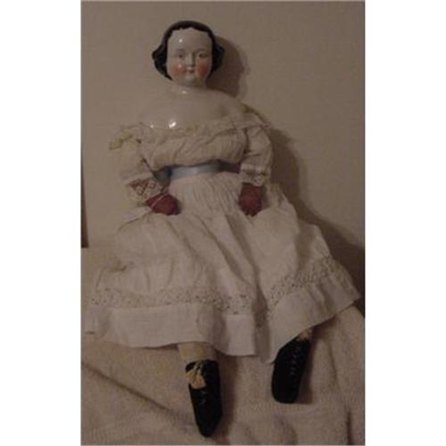 Great large China doll, head is great, very large, has some rubs on the back curls. Head is 7.25" tall and 7.25" left to right, no markings. There is a stress crack I guess you would call it, on the seam of the one shoulder seam. (Pictures is posted of it.) China has a pink cast to it. Would have been made in Germany. Three sew holes front and back. Don't know when it was put on this cloth body with leather arms, not as old as the head that is for sure. Great clothing. <P><P>Shipping is $25, covers shipping, handling and insurance.
