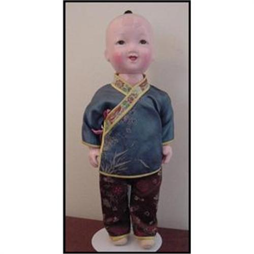 12" Oriental Chinese BOY, little braided pigtail on top of head, painted features. Body is cloth, lower arms and head is a different material, I would assume what they call a composition material. You can see where there are spots where the top layer of paint has come off, but he is just so darn cute, you love him anyway. There is the same on the neck where the head rubs. The head is loose, so you might need to restring it. <P><P>Email with questions.