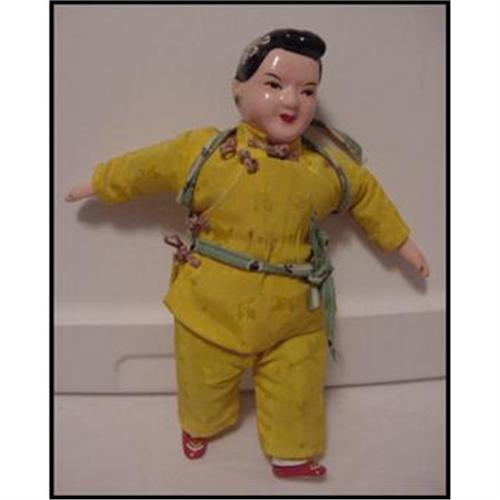 9" Chinese composition type doll. Body is cloth. She has unusual decoration on head and earrings. There is a damage spot on her head, as shown in picture. All original clothing. Painted features.